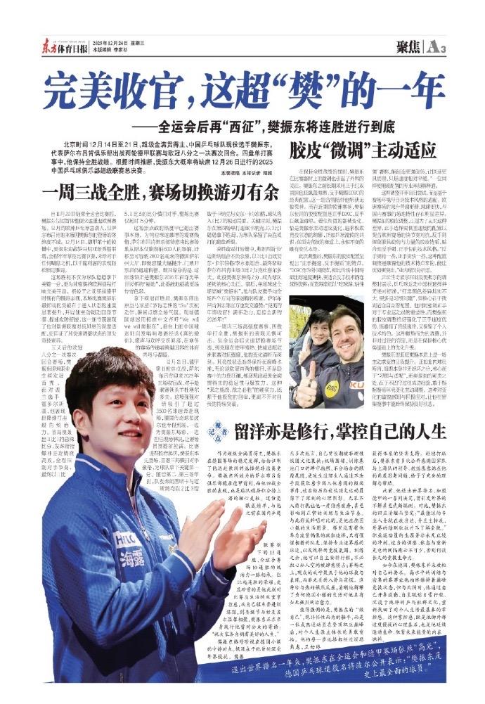 虎扑12月24日讯樊振东登上东方体育日报头版头条:12月14日至21日,超级金满贯得主、中国乒乓球队现役选手樊振东,代表萨尔布吕肯俱乐部出战两轮德甲联赛与欧冠八分之一决赛次回合。四盘单打赛事中,他保持全胜战绩。无论是欧冠首秀的横扫,还是联赛中的力挽狂澜,都展现出超级金满贯得主的稳定性与爆发力。