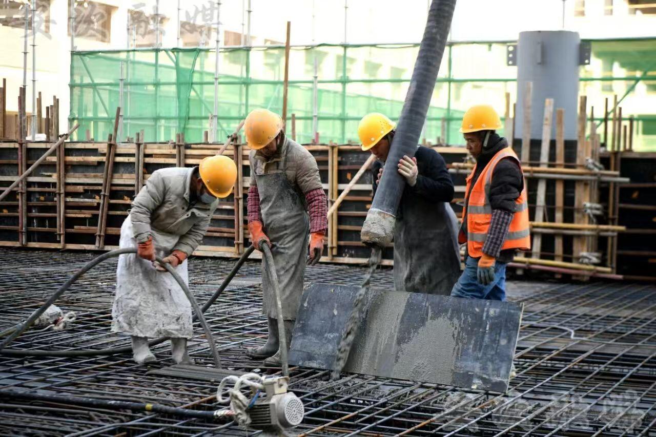 在产业园办公楼施工现场,车库顶板混凝土浇筑作业正有序开展。搅拌车源源不断运送来搅拌均匀的混凝土,通过输送泵精准输送至作业面,工人们将混凝土振捣密实,确保浇筑质量。施工现场的物料运输环节高效有序,工人们各司其职、相互配合。