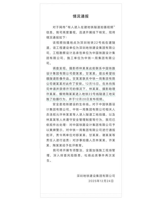 网传有人进入在建隧道拍摄,深圳地铁集团最新回应