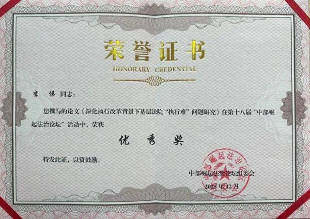 近日,第十八届“中部崛起法治论坛”获奖论文终评结果揭晓。榆次区人民法院法官李伟撰写的论文《深化执行改革背景下基层法院“执行难”问题研究》荣获优秀奖。