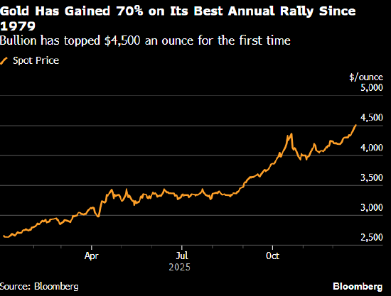 美国股指期货在圣诞假期前夕徘徊于历史高位附近,股市季节性走强的时期即将开始。黄金价格攀升至每盎司4500美元以上。