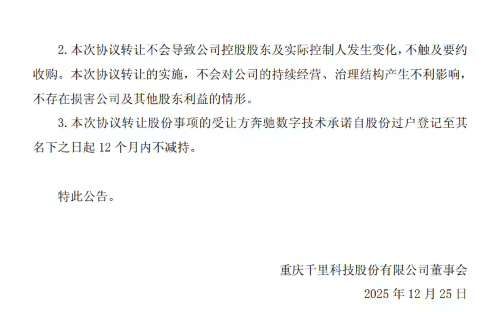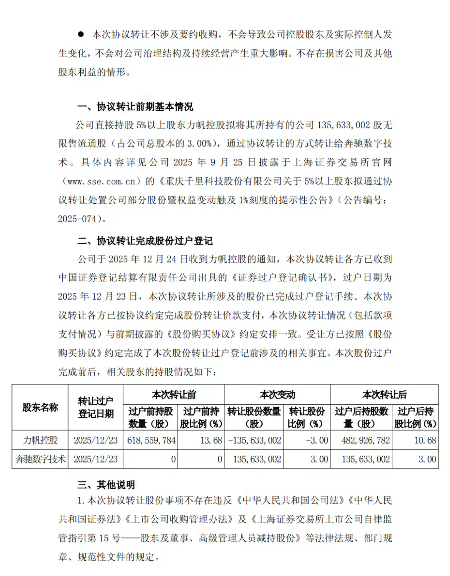 重磅消息:千里科技发出公告,公司已完成股东与梅赛德斯-奔驰(上海)数字技术有限之间的股份过户登记手续,奔驰数字技术以人民币 9.87 元 / 股的价格,通过协议转让方式获得力帆控股持有的 135633002 股股份(占公司总股本的 3.00%)。本次股权过户标志着奔驰入股千里科技的交割正式完成,正式成为千里科技第五大股东。再进一步说,未来国内上市的奔驰新车,搭载千里科技智驾方案基本确定了,在乐观点,也包括全球市场...