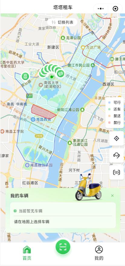 通过租车小程序可以看到,其运营范围被明确划定,在红谷滩区,南起南龙蟠街、北至庐山南大道、东至赣江南大道、西至西一环路的矩形范围内均可使用。此外,服务还覆盖新建区的长堎大道至新建吾悦广场、梅岭大道至豫章师范学院等区域。