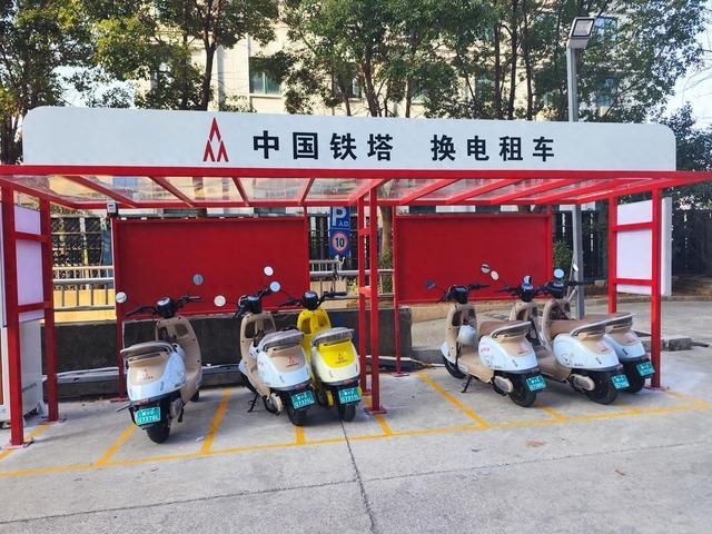 12月21日,在南昌大学前湖校区附近的梦立方广场,一个蓝顶的“中国铁塔换电租车”棚子颇为醒目。棚内整齐停放着数辆黄白或蓝白配色的电动车。