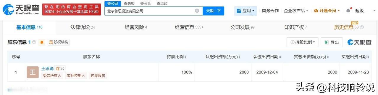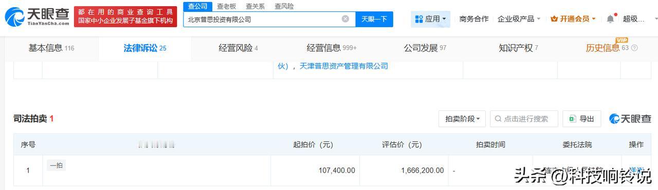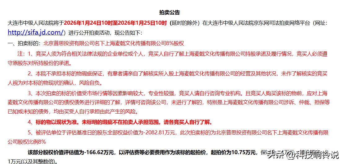 【王思聪公司名下8%股权被法拍 王思聪公司所持股权将被法拍】 天眼查天眼风险信息显示,近日,大连市中级人民法院发布拍卖公告,拍卖标的为北京普思投资有限公司名下上海麦戟文化传播有限公司8%股权。公告显示,该部分股权价值评估值为-166.62万元,以评估费等必要费用作为该标的起拍价,起拍价为10.75万元,保证金1万元,增价幅度0.1万元。 工商信息显示,北京普思投资有限公司成立于2009年12月,法定代表人为王思聪,注册资本2000万人民币,经营范围包括项目投资、投资管理、投资咨询等,由王思聪全资持股。 天眼查信息: