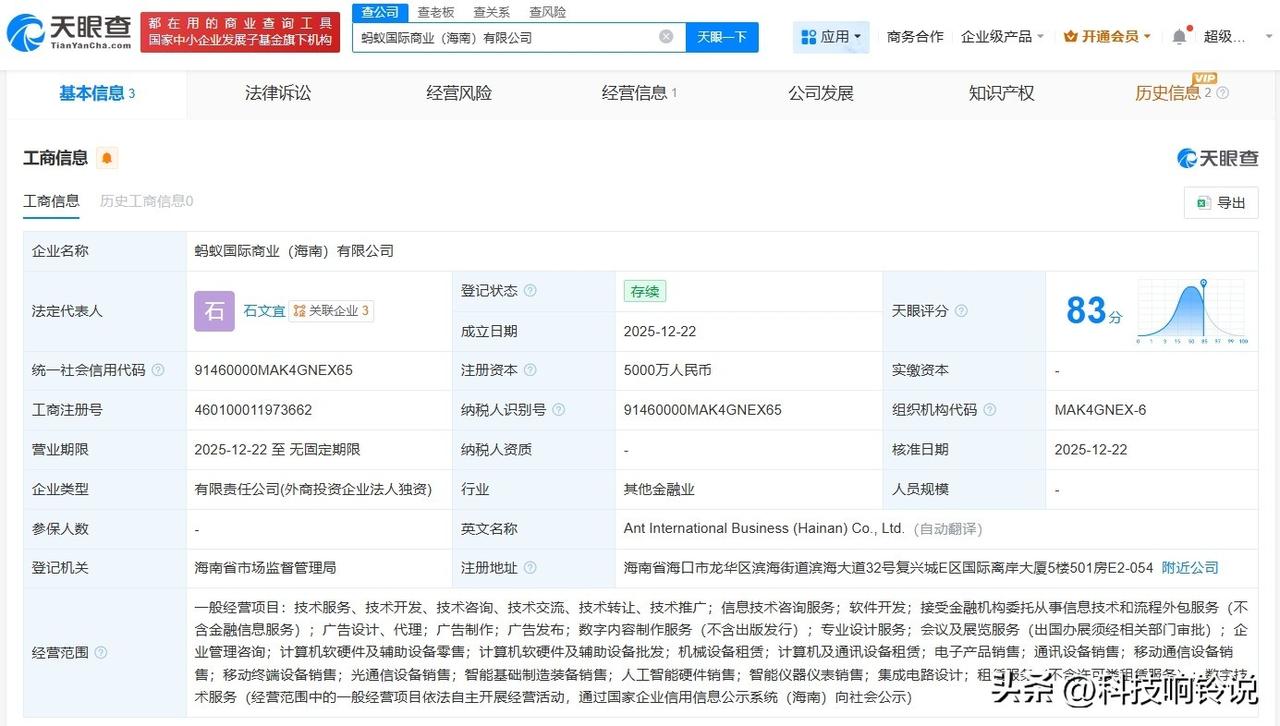 【蚂蚁国际在海南成立新公司 注册资本5000万】 天眼查工商信息显示,近日,蚂蚁国际商业(海南)有限公司成立,法定代表人为石文宜,注册资本5000万人民币,经营范围包括信息技术咨询服务、软件开发、接受金融机构委托从事信息技术和流程外包服务等。股东信息显示,该公司由蚂蚁国际商业(上海)有限公司全资持股。 天眼查信息: