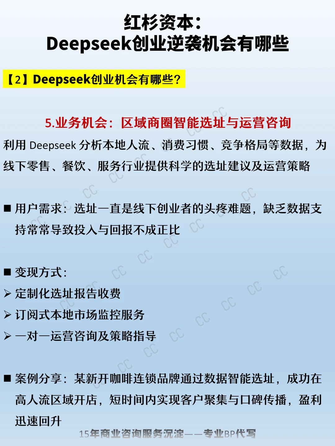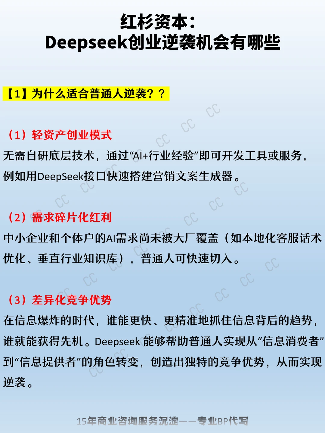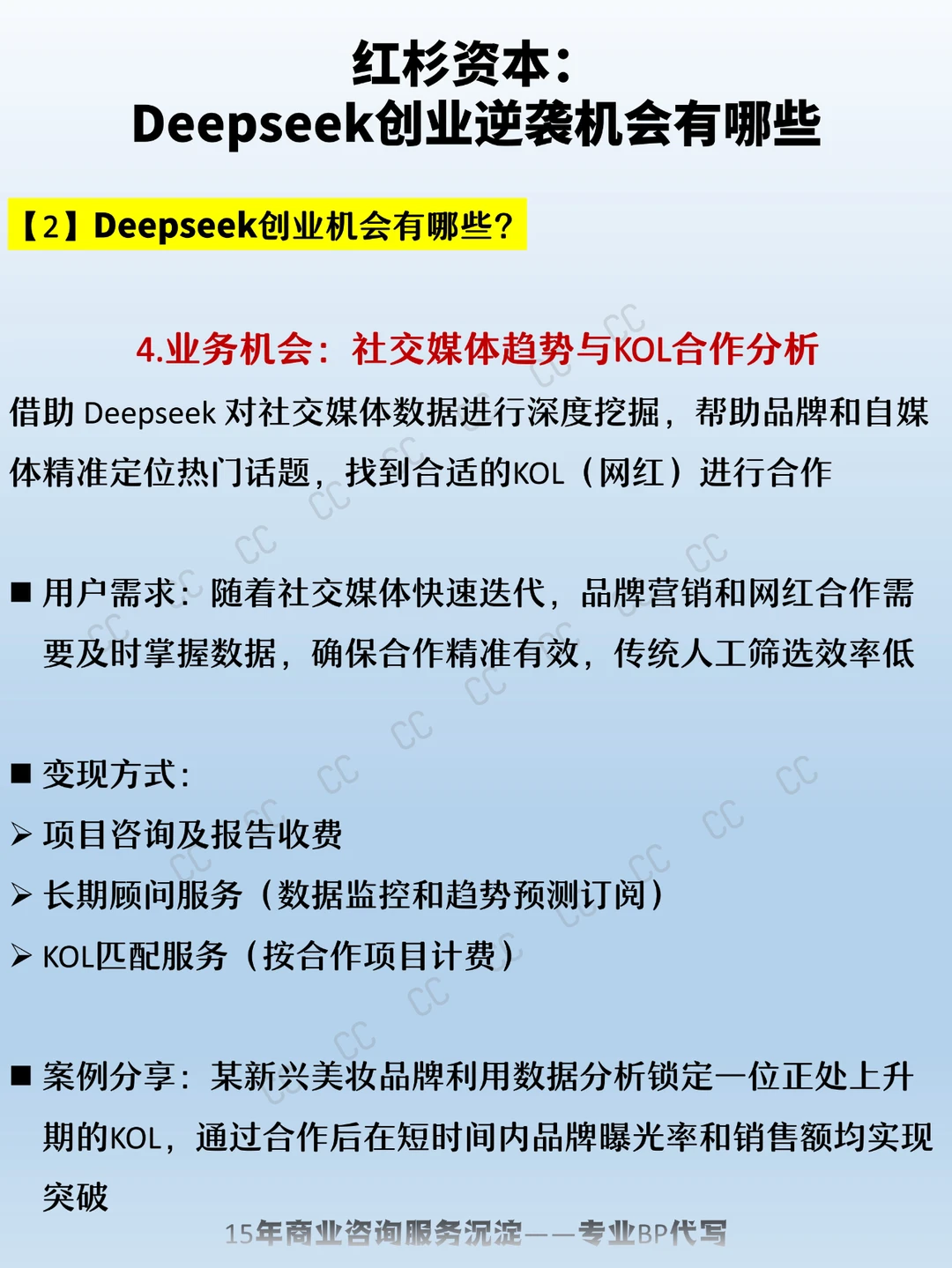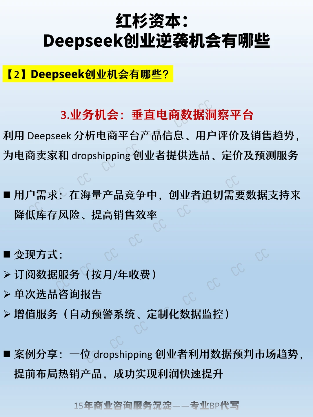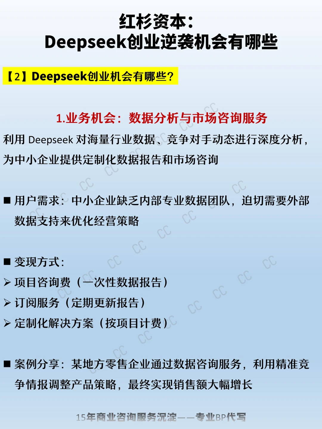 为什么普通人也可以借助Deepseek逆袭创业? Deepseek创业机会方向分享: 1.数据分析与市场咨询 2.内容创作与深度信息服务 3.垂直电商数据洞察平台 4.社交媒体趋势与KOL合作 5.区域商圈智能选址与运营咨询 商业计划书 商业模式 创业 创业项目 deepseek创业