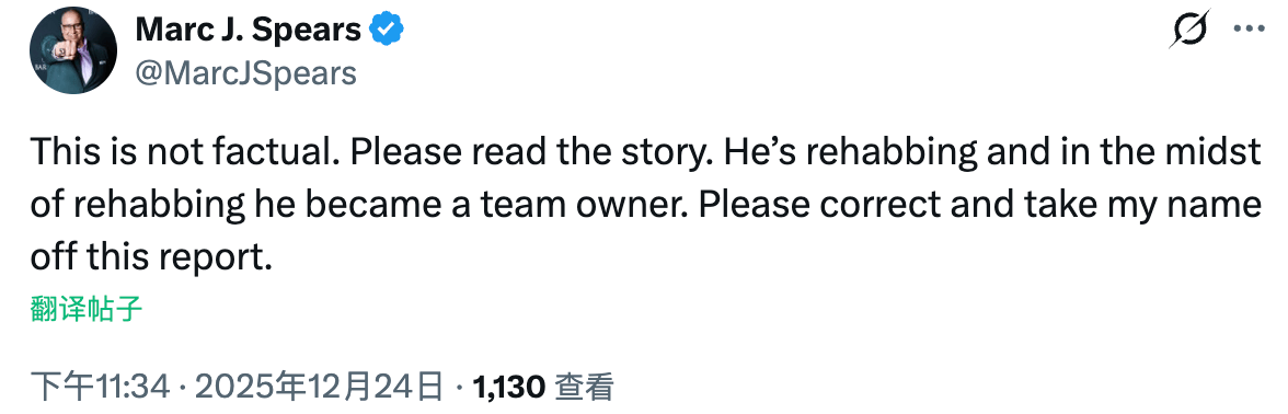 今日,NBA记者MarcJ.Spears更推对这一报道进行了驳斥。