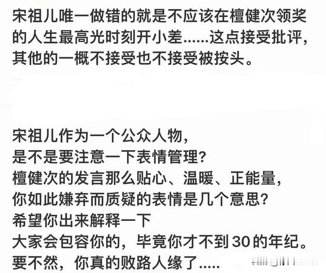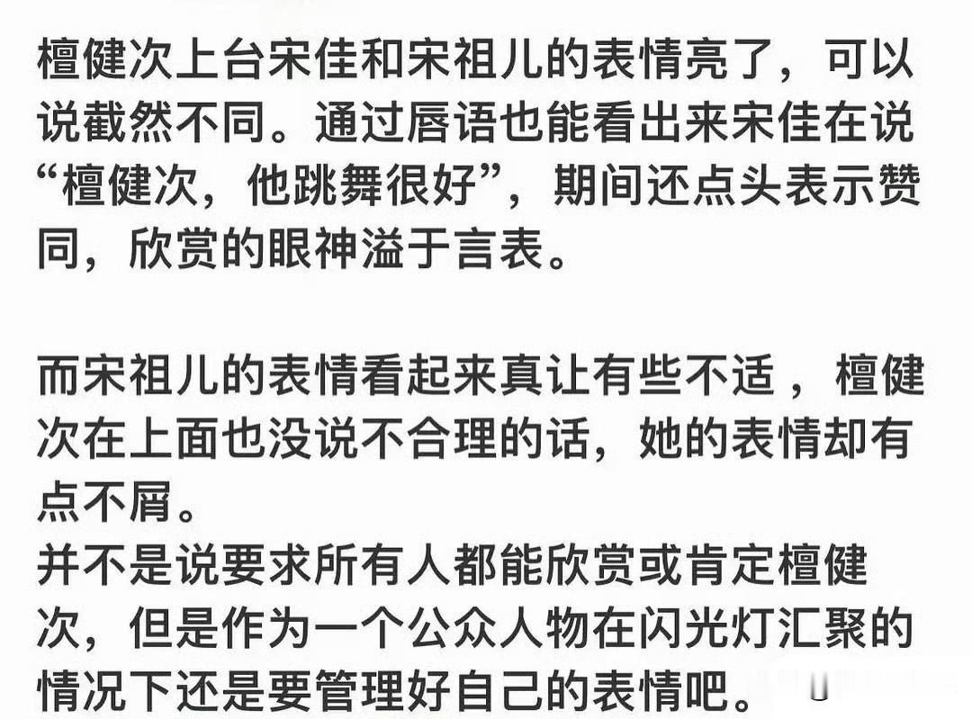 12月24日,宋祖儿在檀健次发言时的微表情引发檀健次粉丝不满,认为她不礼貌! 现场情况是大哥上台说到“每个角色散发出来的那个微光,它一点点的照亮了我自己,也照亮了很多观众”时,宋祖儿有点被肉麻到了,侧脸看向刘宇宁,刘宇宁全程面带浅笑 没想到星光大赏都过去3天了,还有“磨擦”发生,这件事其实太过于被放大了,宋祖儿肯定对大哥没有嫌弃的意思,只是觉得自己说不出这话,觉得有点肉麻文艺而已! 她肯定不会针对大哥,大哥也不会因为她的表情而生气或者多想,大家都是同事,和和睦睦的宋祖儿