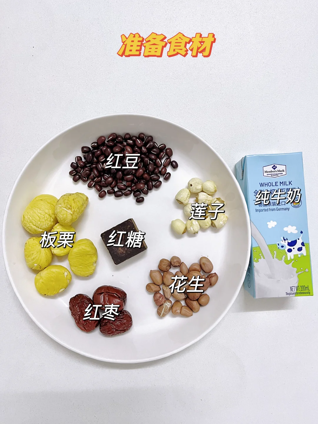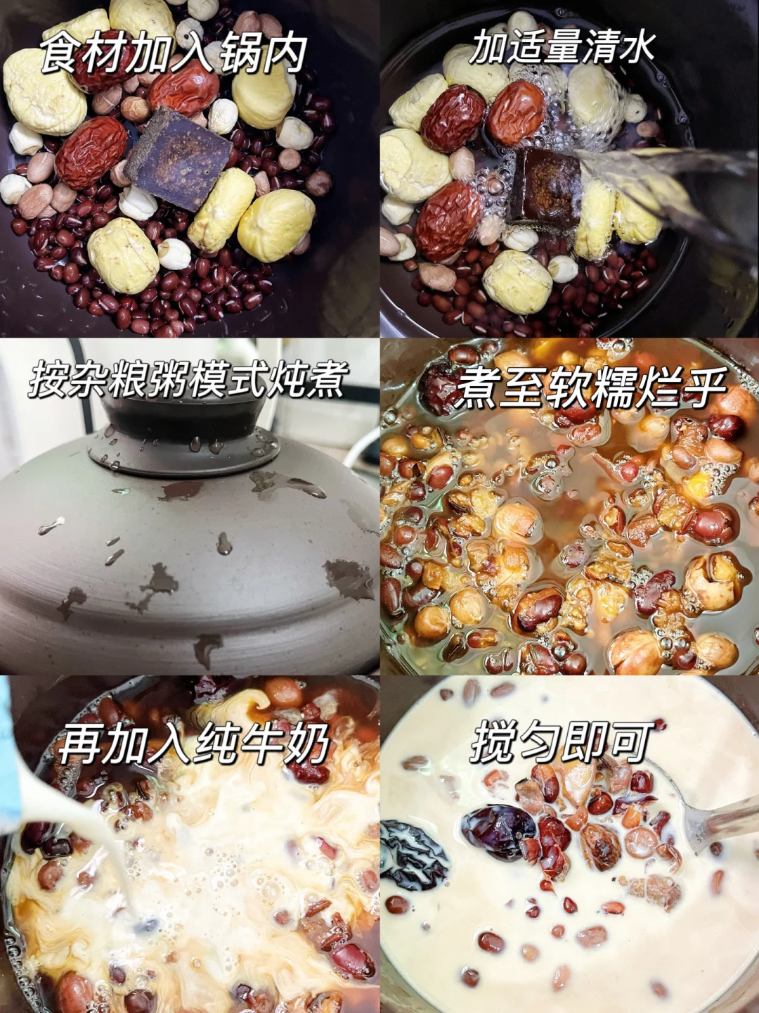 板栗6颗、红豆1把、花生1把、莲子适量、红枣3颗、红糖1块、纯牛奶200ml