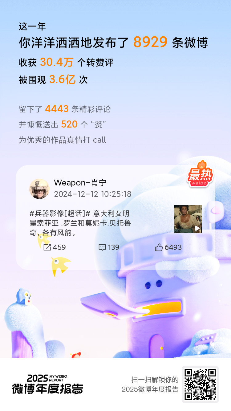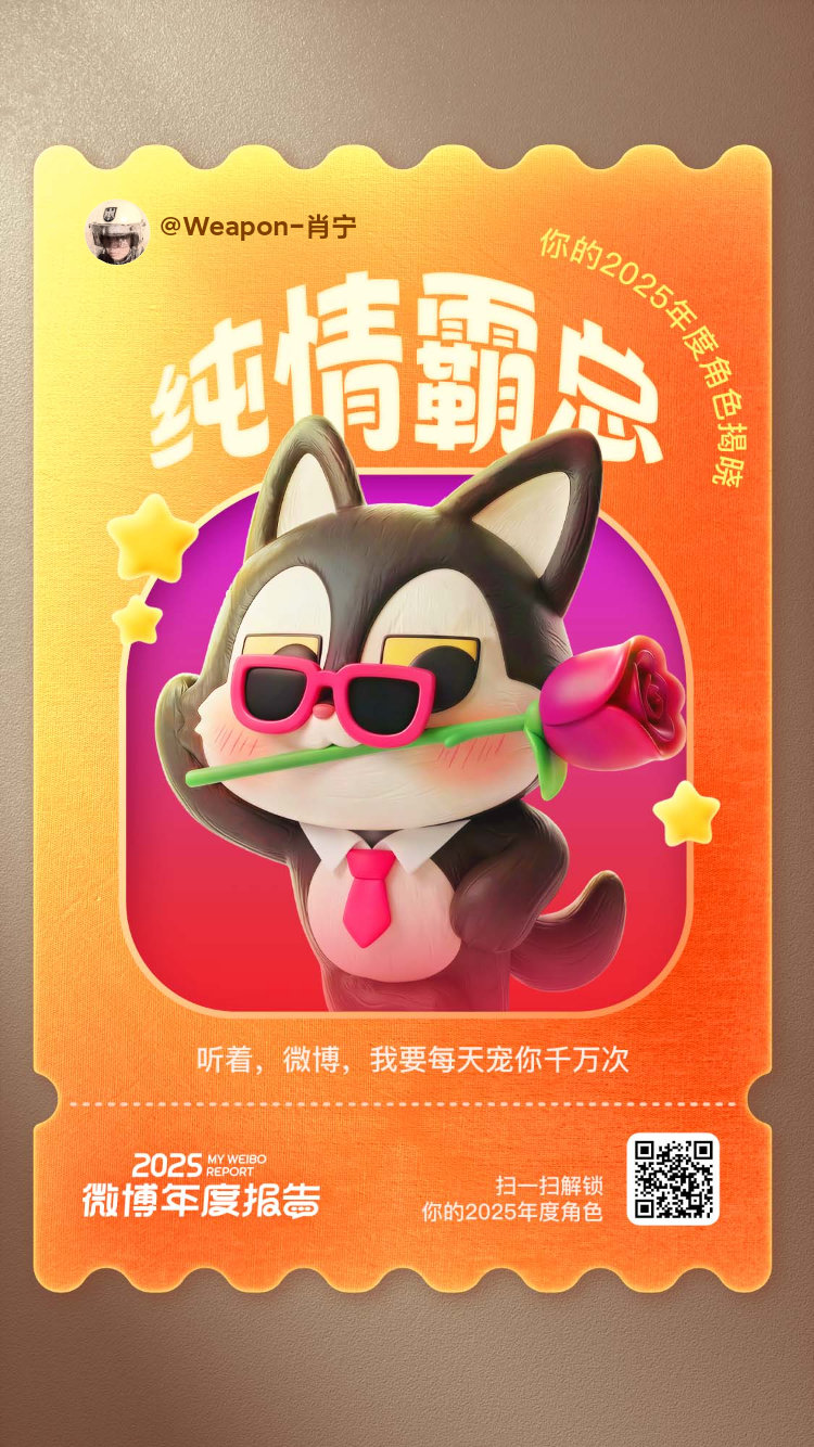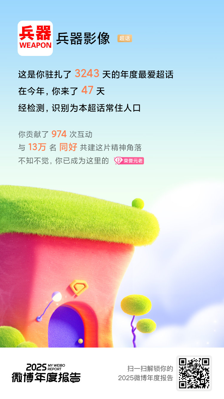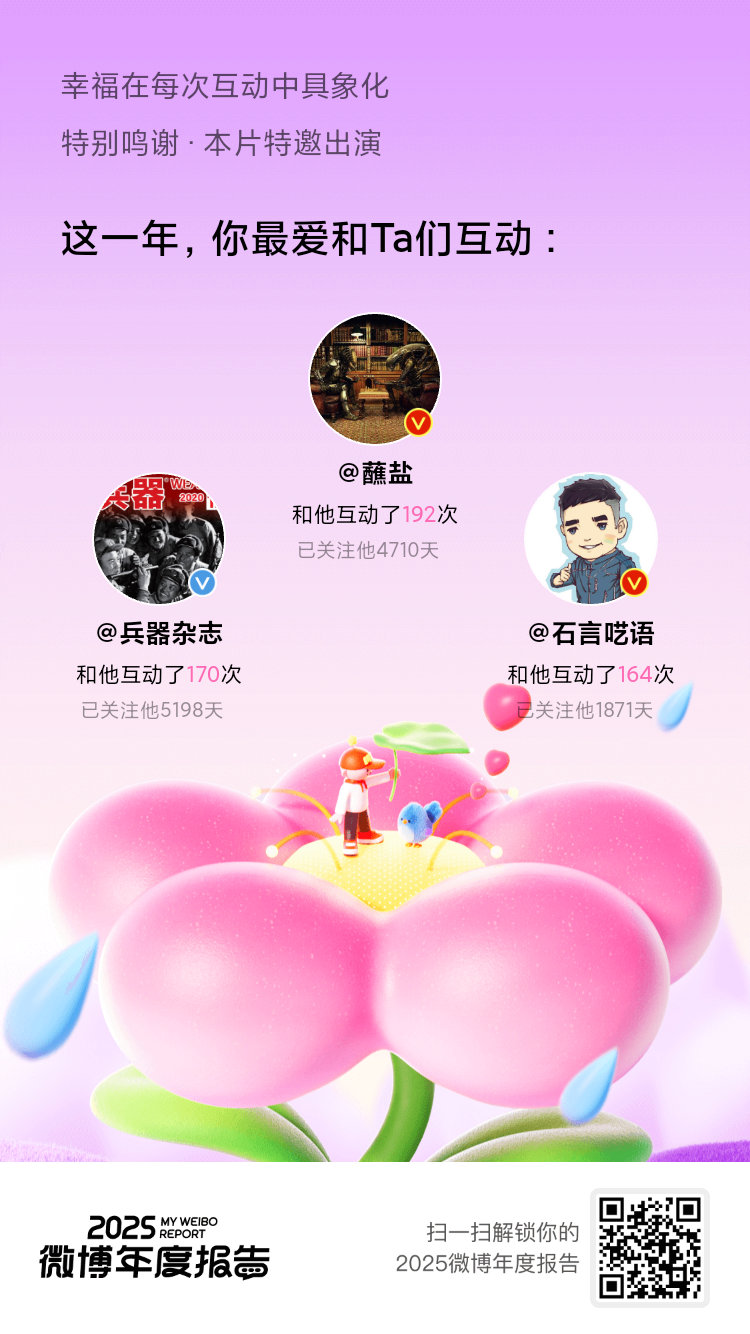 微博年度报告 实力这一块,咱确实拿捏了!2025年稳稳保持 金V身份365天!相逢的意义在于彼此照亮,这份成绩单离不开你们一直以来的支持和陪伴!你的专属年度播报也已生成,速来>>2025微博年度报告 围观!微博之夜