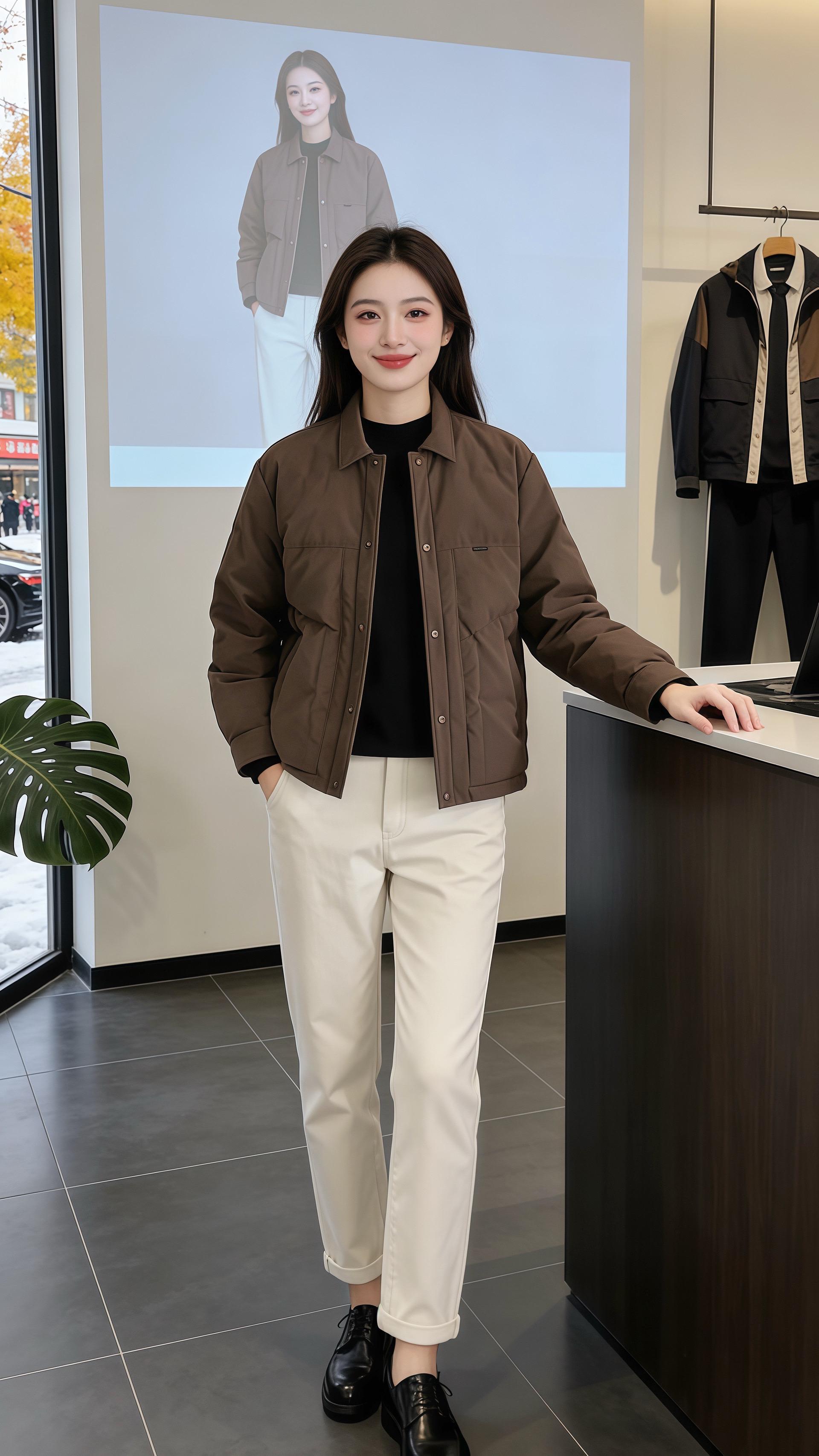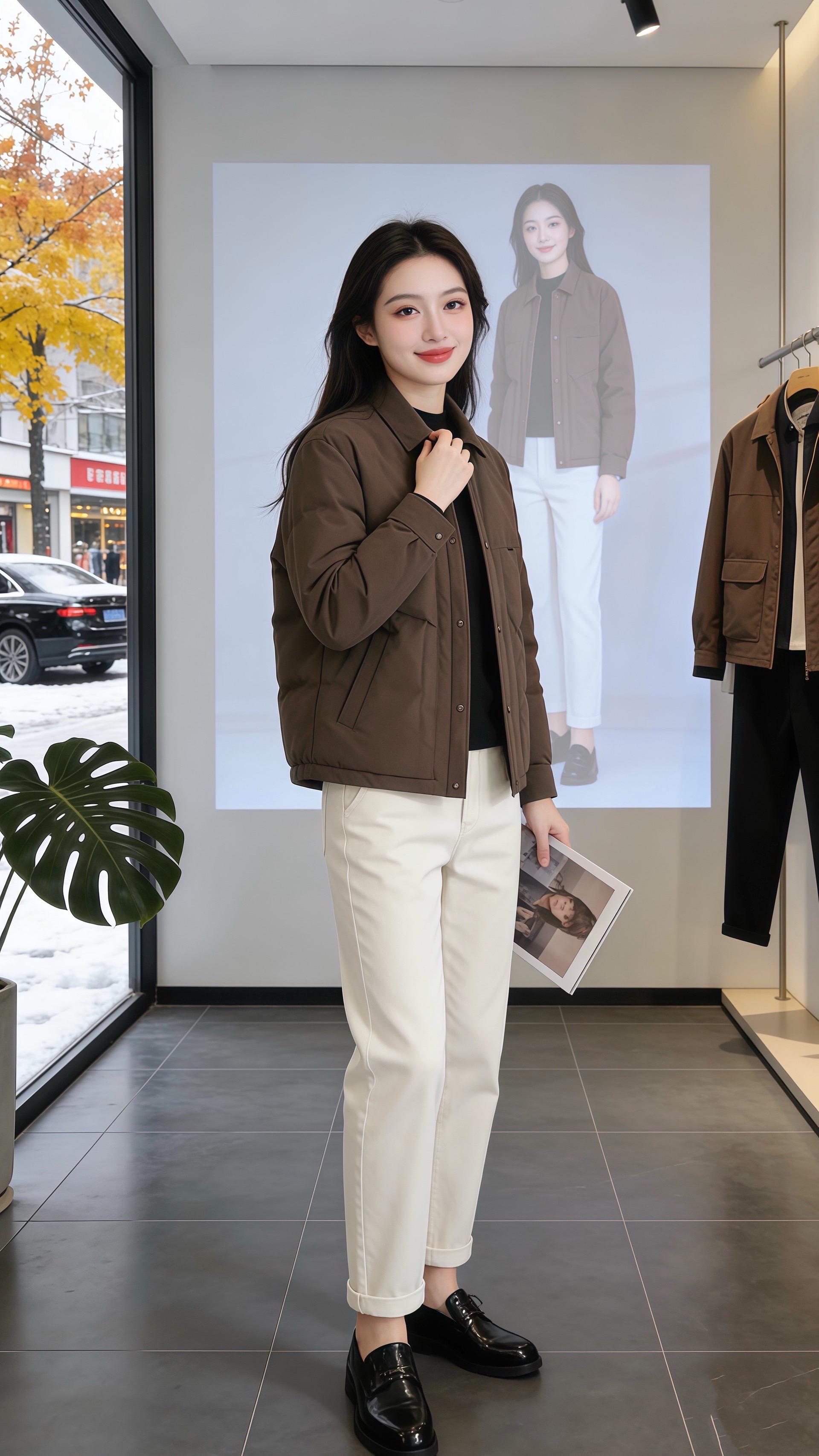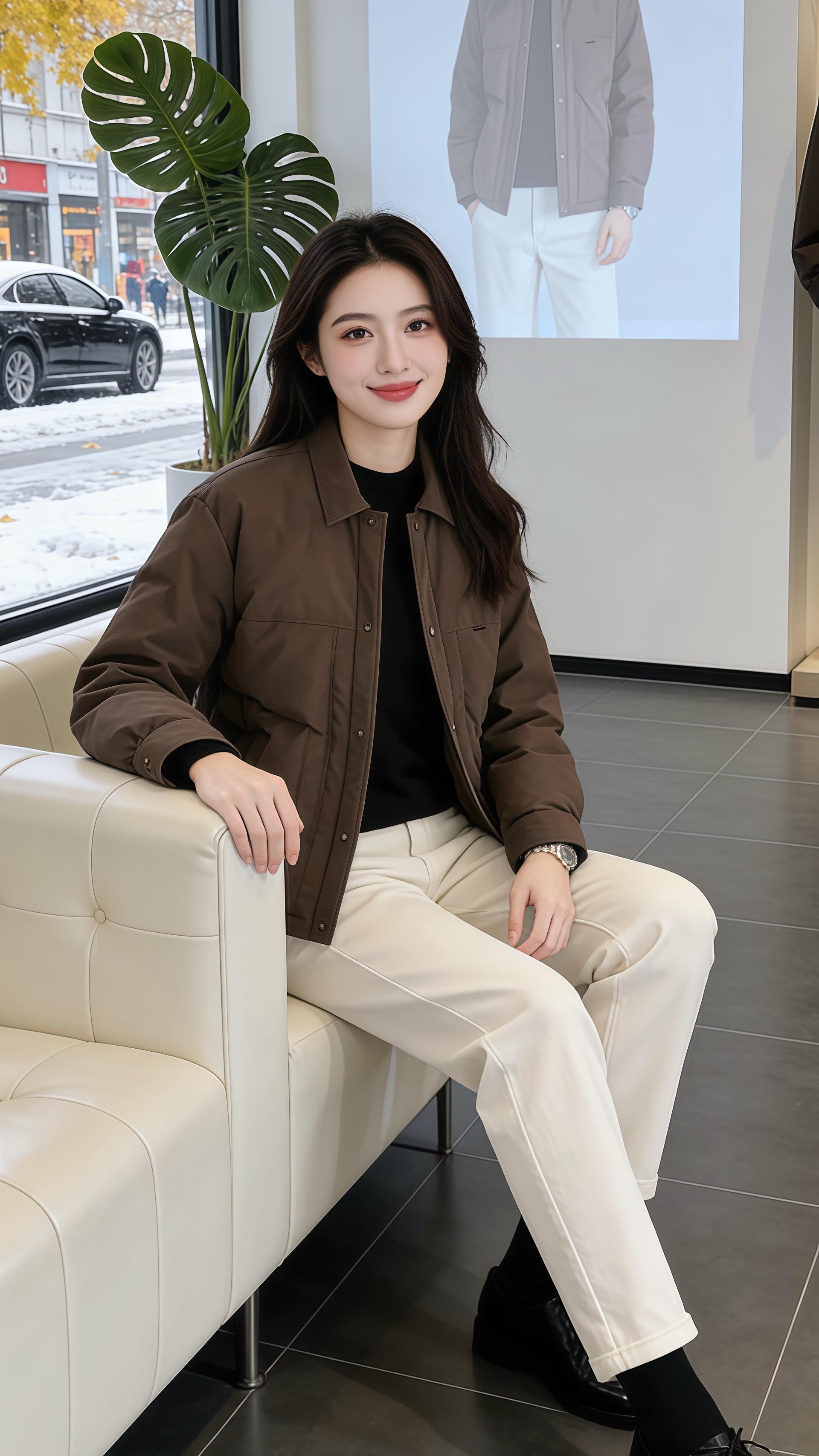 冬雪黏在男装店橱窗的午后,他推门进来,目光先被她咖色夹棉外套勾住。面料带着哑光的细腻,翻领衬得内搭黑高领的脖颈线条利落,米白长裤配亮面黑皮鞋,将冬的冷硬揉成了焦糖般的温软。 她倚着柜台整理衣领,外套袖口的弧度贴在腕骨,比橱窗里的成衣更鲜活。他递过一杯热美式时说:“这咖色像磨好的可可粉,醇厚又衬得人温柔。”她笑,捻了捻领口黑边:“随手搭的,竟和店里的皮质柜台刚好衬。” 出门时他替她拍落肩头雪,指尖擦过夹棉面料。他忽然懂了,好看从不是衣装本身,是她把咖的醇、白的净,穿成了他眼里独一份的心动。