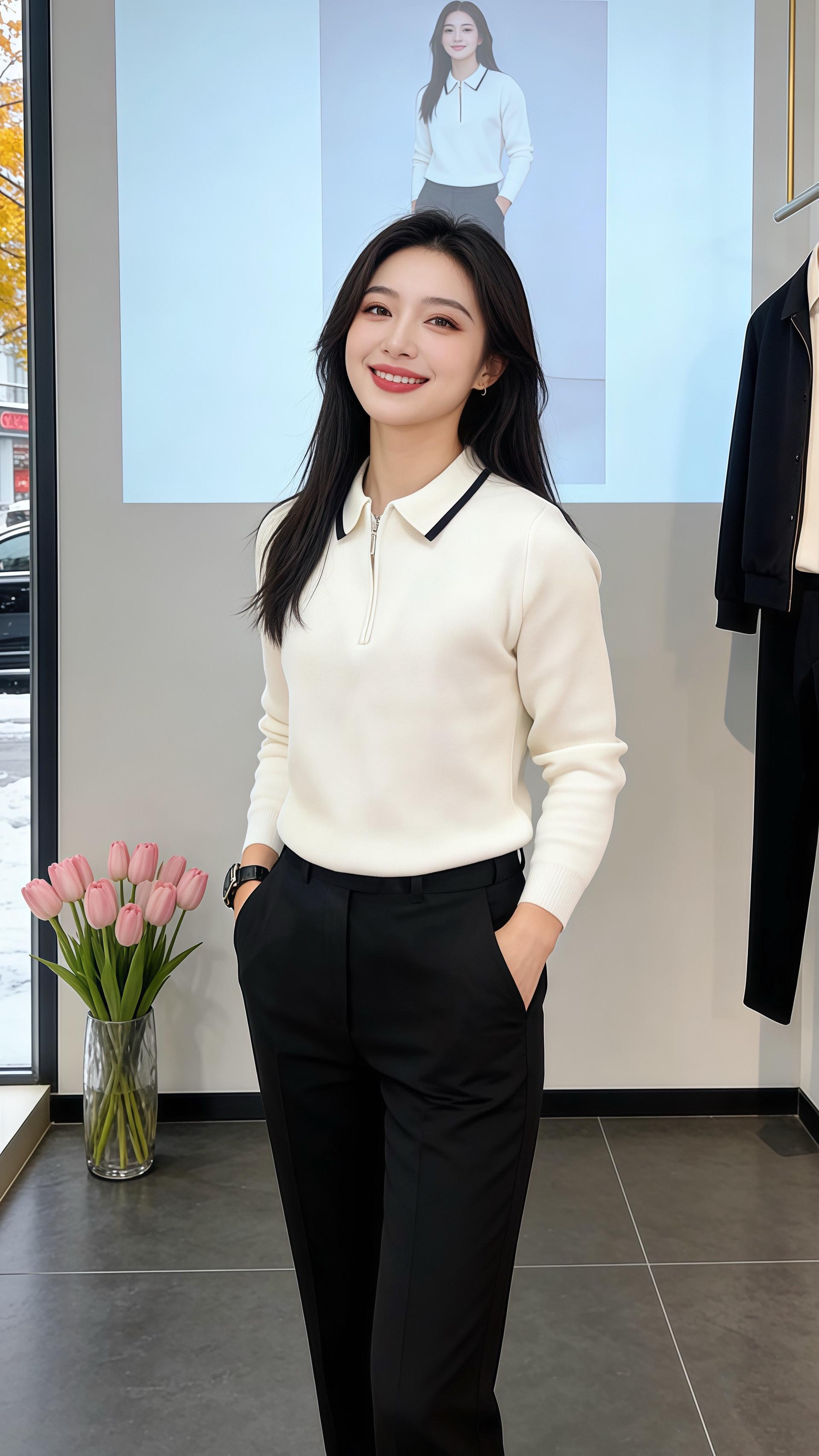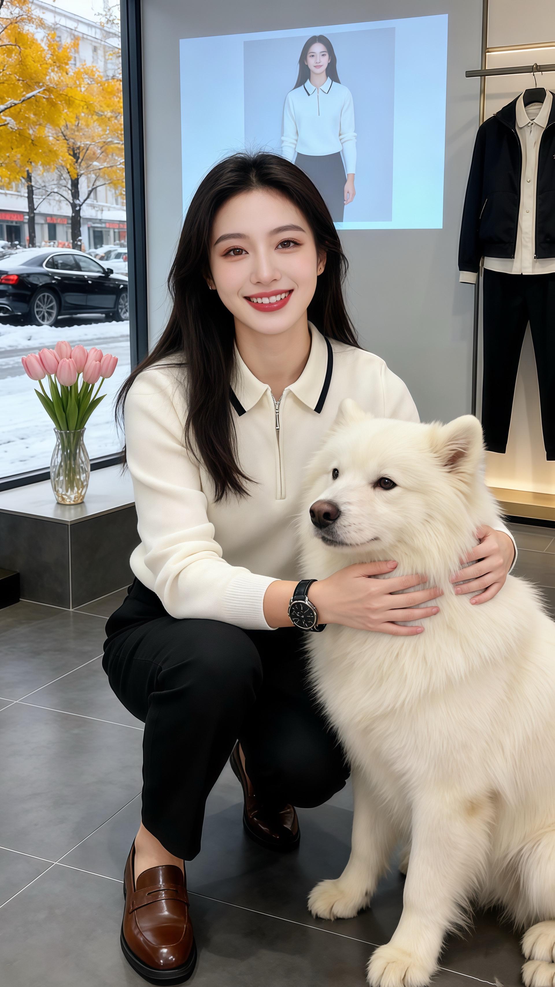 雪粒敲着服饰店玻璃时,皓明撞见许妍。她的米白Polo领针织衫,领口黑边衬得肩线软而利落,黑裤直筒版型勾勒出沉稳线条,棕皮鞋的光泽成了恰到好处的点缀,身旁萨摩耶凑过来蹭她手心,与这身搭配相映成趣。