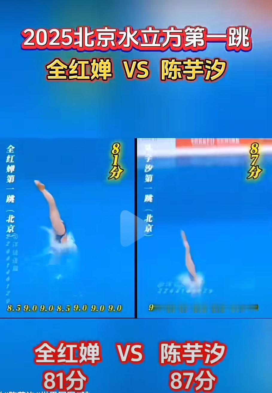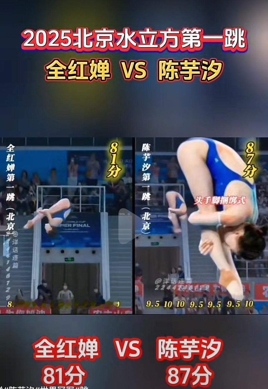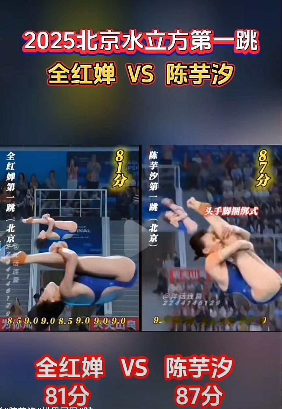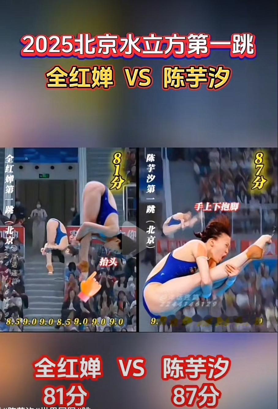 陈芋汐和全红婵 2025年世界杯总决赛 第一跳107B难受系数3.0 (向前翻腾三周半屈体) 陈芋汐87分,全红婵81分 从技术细节来看, 全红婵在空中的身体姿态控制稍有不足,未完全伸直且抬头,成为扣分点; 而陈芋汐不仅姿态控制更为标准, 入水水花也更小、更低, 展现出扎实的空中技术与细腻的入水处理。 陈芋汐被不少观众誉为“跳水一姐”, 其动作的稳定性与完成度背后, 离不开从小训练体操所奠定的 超凡身体控制力与核心功底。 这份几乎无人能匹敌的“童子功”, 正是她在高水准竞争中 始终保持优势的重要根基。 动作见真功,细节定高下。 每一分的差距,都是常年积累的映照。