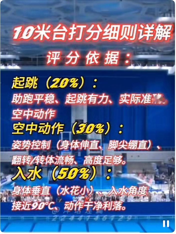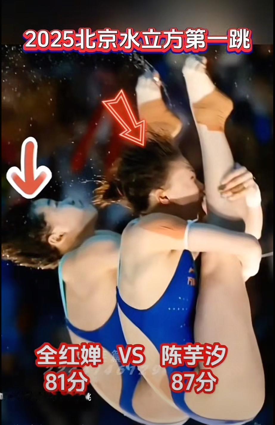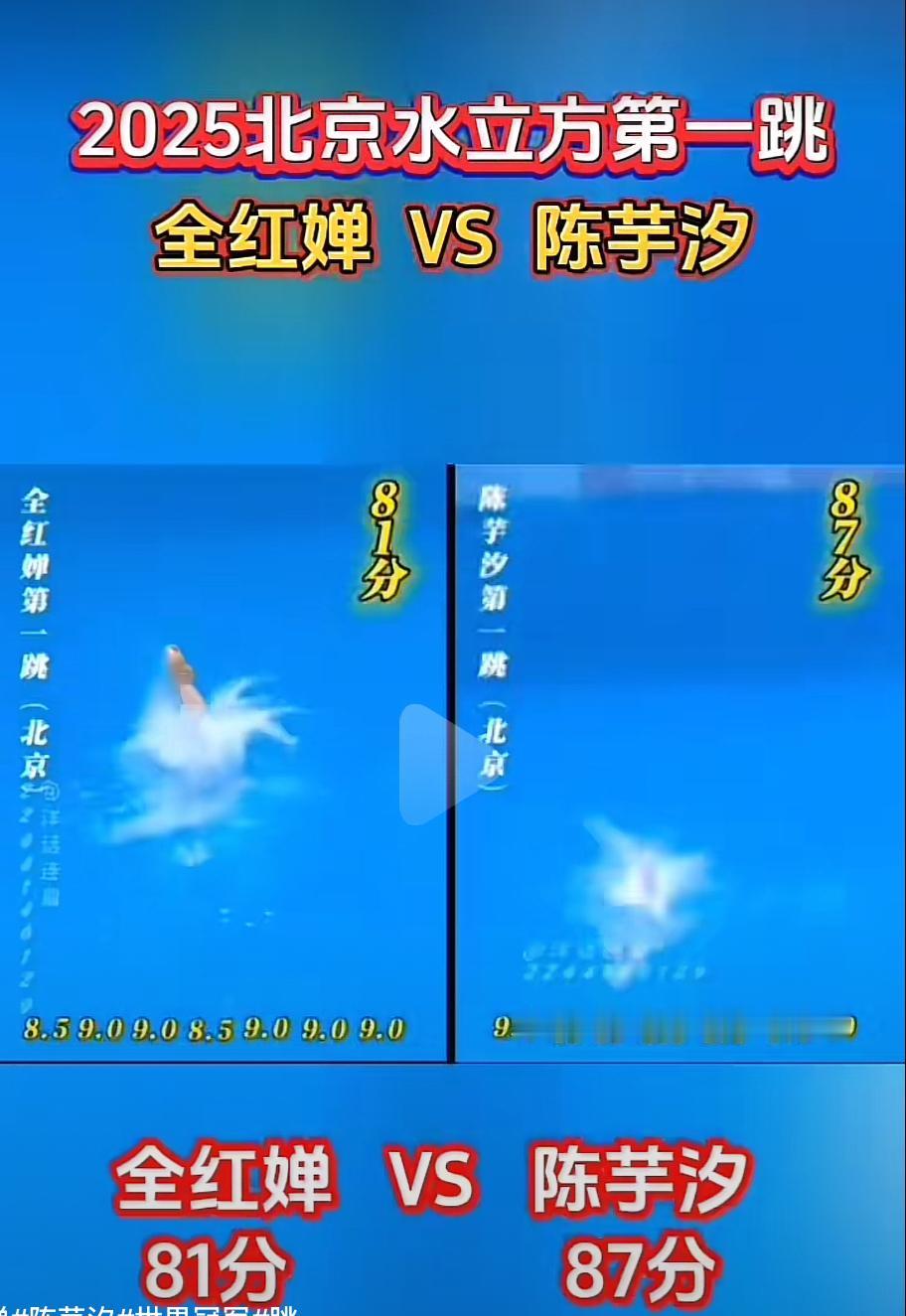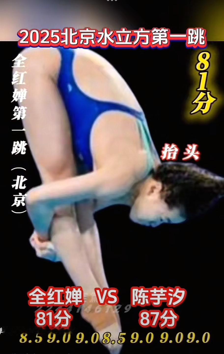 陈芋汐和全红婵 2025年世界杯总决赛 第一跳107B难受系数3.0 (向前翻腾三周半屈体) 陈芋汐87分,全红婵81分 从技术细节来看, 全红婵在空中的身体姿态控制稍有不足,未完全伸直且抬头,成为扣分点; 而陈芋汐不仅姿态控制更为标准, 入水水花也更小、更低, 展现出扎实的空中技术与细腻的入水处理。 陈芋汐被不少观众誉为“跳水一姐”, 其动作的稳定性与完成度背后, 离不开从小训练体操所奠定的 超凡身体控制力与核心功底。 这份几乎无人能匹敌的“童子功”, 正是她在高水准竞争中 始终保持优势的重要根基。 动作见真功,细节定高下。 每一分的差距,都是常年积累的映照。