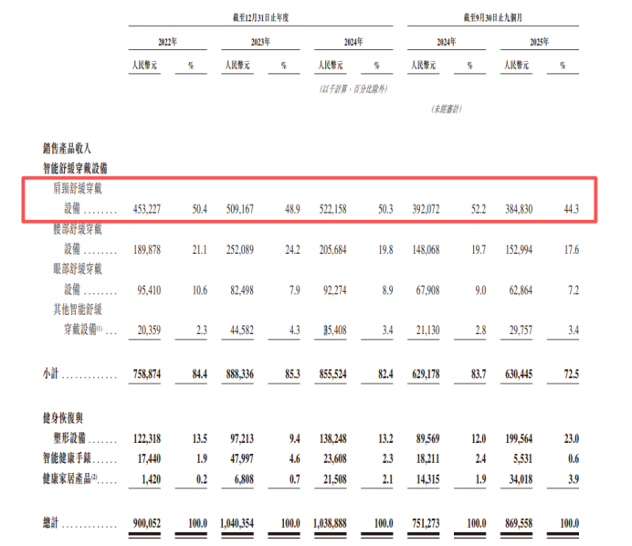 从细分产品来看,未来健康核心产品主要是肩颈舒缓穿戴设备,近年来收入占比超过40%。值得关注的是,2025年前三季度,未来健康该品类收入同比出现下滑。根据招股书,2025年前三季度,公司来自肩颈舒缓穿戴设备收入为3.85亿元,同比下降1.85%,营收占比为44.3%。