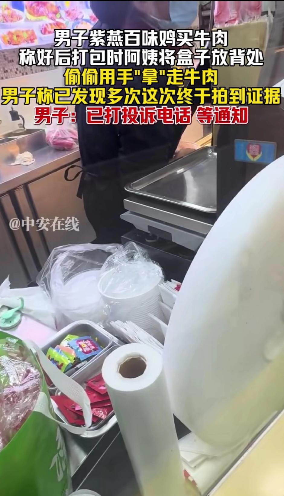 男子紫燕百味鸡买牛肉,称好后打包时阿姨将盒子放背处偷偷用手“拿”走牛肉。 男子称