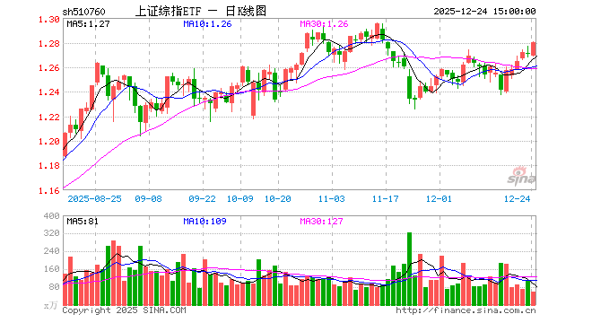 12月24日,上证综指ETF(510760)涨0.71%,成交额7572.51万元。当日份额减少1800.00万份,最新份额为17.97亿份,近20个交易日份额减少1.35亿份。最新资产净值计算值为22.98亿元。