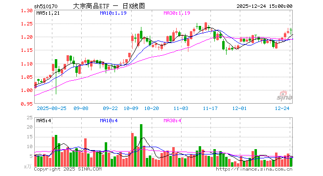 12月24日,大宗商品ETF(510170)涨0.25%,成交额529.90万元。当日份额增加200.00万份,最新份额为2.61亿份,近20个交易日份额增加1200.00万份。最新资产净值计算值为3.19亿元。
