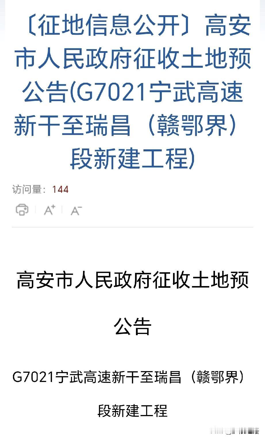 好消息!江西新干至瑞昌高速公路高安段发布了土地征收预公告,拟征收面积约达6086