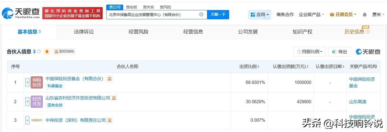 【中国保险投资基金等在北京成立企业管理中心 出资额143亿】 天眼查App显示,近日,北京中保鲁高企业发展管理中心(有限合伙)成立,执行事务合伙人为中保投资(深圳)有限责任公司,出资额143亿人民币,经营范围为企业管理、企业管理咨询,由中国保险投资基金(有限合伙)、山东省农村经济开发投资有限公司、中保投资(深圳)有限责任公司共同出资。 天眼查信息: