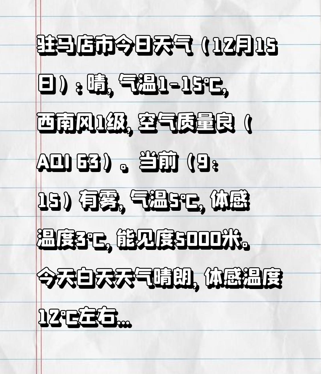 驻马店市今日天气(12月15日):晴,气温1-15℃,西南风1级,空气质量良(AQI 63)。当前(9:15)有雾,气温5℃,体感温度3℃,能见度5000米。今天白天天气晴朗,体感温度12℃左右,适宜外出活动;夜间气温降至1℃,体感温度-2℃,需注意保暖。全天无降水,紫外线指数较弱,空气质量良好。 生活建议:天气温凉,建议增加衣物厚度;感冒易发,少去人群密集场所;适宜洗车和旅游,但受雾影响不宜户外运动和钓鱼