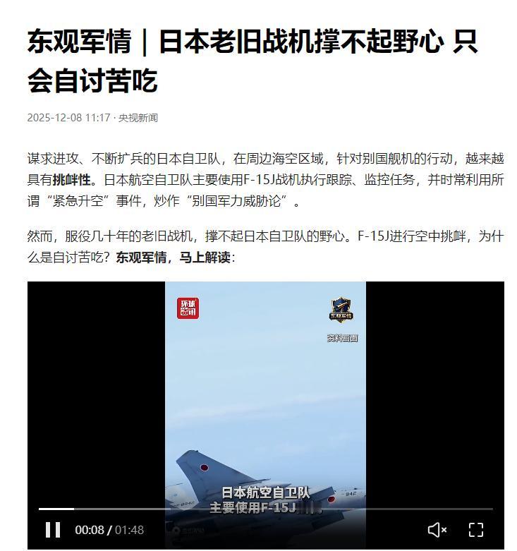 据俄罗斯“塔斯社”在12月14日透露的消息称:中国的辽宁舰航母在世界公认的海域正在执行战备任务时再次遇上日本航空自卫队的二架F-15战斗机进行侦察,并进行了许多危险的动作。   针对日本的这种危险的动作中国辽宁舰上的二架歼-15型双发型战斗机立即升空起飞准备迎接日本航空自卫队的二架战斗机、并且打开了“警戒雷达”开始警告日本航空自卫队的私自闯入我方已经划下的红线、如果继续保持这种状态一切后果自负。   其实熟悉西太平洋海域动态的朋友都清楚,辽宁舰编队此次战备任务期间遭遇日本F-15战机袭扰,并非孤立事件,但这次中方的应对力度和日本战机的窘迫处境,却实实在在给地区局势提了个醒。   根据塔斯社12月14日的报道细节,辽宁舰当时正在冲绳东南海域开展常规战备作业,这片海域是国际社会公认的公海区域,中方舰艇在此执行任务完全符合《联合国海洋法公约》,既无任何越界行为,更不存在所谓“威胁地区安全”的说法,反倒是日本航空自卫队的两架F-15战机,未经任何通报便擅自抵近侦察,甚至做出穿插编队航线、近距离盘旋等危险动作,这种主动挑衅的意图不言而喻。   面对日方的危险举动,辽宁舰的应对堪称果断且专业。甲板上的两架歼-15双发战斗机迅速完成起飞准备,伴随着滑跃甲板的轰鸣声升空,随即打开警戒雷达对F-15战机进行锁定警告。   可能有朋友不清楚,警戒雷达锁定意味着什么,这相当于在空战中用瞄准镜对准了目标,对方的飞行轨迹、速度等数据会被实时捕捉,一旦对方继续做出危险动作,中方战机可随时采取进一步反制措施。   最终的结果也印证了中方警告的威慑力,日本F-15战机在被锁定后,迅速做出大机动规避动作,仓皇撤离了现场,压根没敢停留。   很多人会疑惑,日本为什么总盯着中国航母编队不放?其实翻看日本防卫省的公开数据就能找到答案,2024年度日本航空自卫队针对“外国飞机”的紧急升空次数达到704次,较上一年增加了35次,而执行这些任务的主力,正是这次现身的F-15J战机。   但有意思的是,这款被日本寄予厚望的战机,早已是“老态龙钟”的状态。根据权威航空分析机构的数据,日本航空自卫队的155架单座F-15J战机,平均机龄超过37年,44架双座F-15DJ战机的平均机龄也超34年,堪称“爷爷辈”的战机。   近年来,这款战机频繁出现飞行中零件脱落、紧急迫降等事故,用这样一款老旧战机执行高危抵近侦察任务,不仅难以对中方形成威慑,反而容易因设备故障引发空中冲突,说白了就是在拿飞行员的生命赌运气。   更值得一提的是,日本此次挑衅的时机格外微妙。就在辽宁舰执行战备任务期间,日本防卫省还高调宣布开展针对舰的饱和打击演练,出动12架战机携带48枚反舰导弹,试图营造“威慑姿态”,可现实却是,其老旧的F-15J在歼-15面前连正面抗衡的勇气都没有。   要知道,歼-15作为我国自主研发的舰载战斗机,具备优异的制空作战和对海打击能力,搭载的有源相控阵雷达、远程空空导弹等装备,在性能上对老旧的F-15J形成了代差优势。此次辽宁舰编队在短短7天的部署中,舰载机起降量达到260架次,这种高强度的作业能力,足以证明我国航母编队的实战化水平已经相当成熟,绝非日本那些老旧装备能随意挑衅的。   可能有人会说,公海不是可以自由航行吗?日本战机侦察一下又怎么了?这里必须明确一个核心原则:公海自由不等于“挑衅自由”。中国海军在公海执行战备任务,是主权国家的合法权利,而日本战机未经允许抵近侦察、做出危险动作,本质上是对中方编队航行安全的威胁,更是对地区和平稳定的破坏。   这一点,我国国防部早有明确表态,此前美军舰近距离侦察辽宁舰时,中方就曾直接予以警告驱离,并指出这种行为严重干扰演训活动,威胁双方人员安全。日本此次的做法,和美军的危险行径如出一辙,说白了就是想通过这种“碰瓷式”挑衅,炒作“中国威胁论”,为自身扩充军备找借口。   事实上,日本用老旧的F-15J来挑衅辽宁舰编队,本身就是一种“自不量力”的表现。其新式的F-35A战机虽然号称先进,却因可靠性问题频繁发生坠毁、迫降事故,几乎从未执行过紧急升空任务,而且在远程飞行、机动性等方面,甚至不如老旧的F-15J。   这种新老装备都“掉链子”的局面,注定让日本的挑衅行为沦为笑柄。反观中国,从辽宁舰入列到福建舰下水,短短十余年时间便实现了航母发展的跨越式进步,舰载机部队的实战化水平不断提升,这种发展速度和实力,绝非日本短期内能够追赶的。   此次事件最终以日本战机仓皇撤离告终,再次印证了一个道理:任何危险的挑衅行为,在绝对的实力和坚定的决心面前,都注定不会成功。中国海军走向深蓝,是维护国家利益的必然选择,也是维护地区和平稳定的重要力量。我们从不主动挑起冲突,但也绝不惧怕任何挑衅。