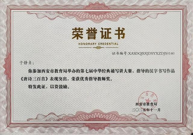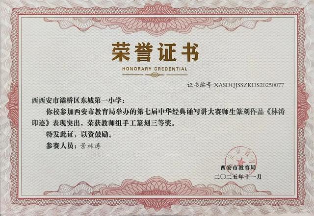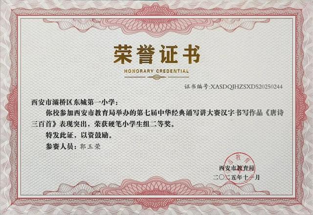 中华经典,是中华民族历经千年沉淀的文化瑰宝。"诵"经典,可聆听先贤智慧的回响;"写"经典,能触摸文字背后的温度;"讲"经典,更能让古老文明在新时代焕发新生。近日,西安市第七届中华经典诵写讲大赛获奖证书姗姗来迟——西安市灞桥区东城第一小学3名教师获得"优秀指导教师"称号,5项硬笔作品分别获得二等奖和三等奖,3项毛笔作品获得三等奖,2项篆刻作品分获三等奖和优秀奖,师生不同种类作品均榜上有名,用实力展现了灞桥区东城第一小学文化教育的丰硕成果!