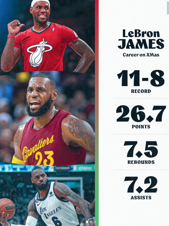 詹姆斯生涯圣诞大战11胜8负,期间场均26.7分7.5篮板7.2助攻