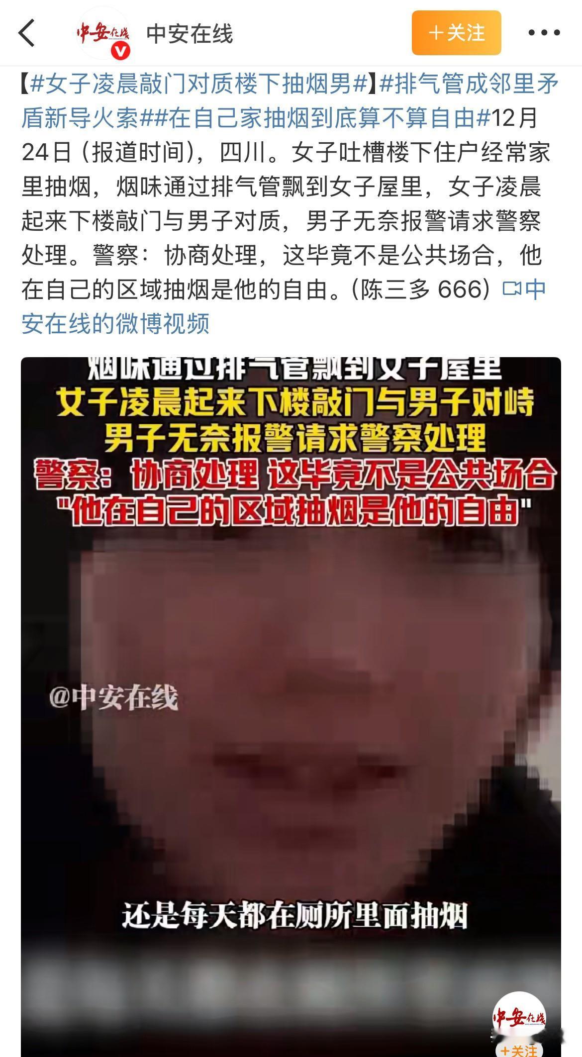 在凌晨,四川一女子被浓烈的烟味呛醒。味道是从楼下邻居家厕所的排气管倒灌进来的。这已经不是第一次。她忍无可忍,冲下楼敲响了邻居的门。 男邻居开门后非常不解,反问:“我在自己家抽烟,有什么问题?”两人争执不下,男子最终选择报警。 警察到场处理。民警的调解很明确:在私人场所抽烟,属于个人自由,建议双方协商。 这件事的争议点就在这里:一方认为,关起门来在自己家,做什么都是自己的权利。另一方认为,当你的行为(比如抽烟)产生的后果(比如烟味)已经实实在在地侵入并影响了我的居住环境时,你的权利就该有边界。 谁有理?似乎都有一点。怎么解?目前无解。