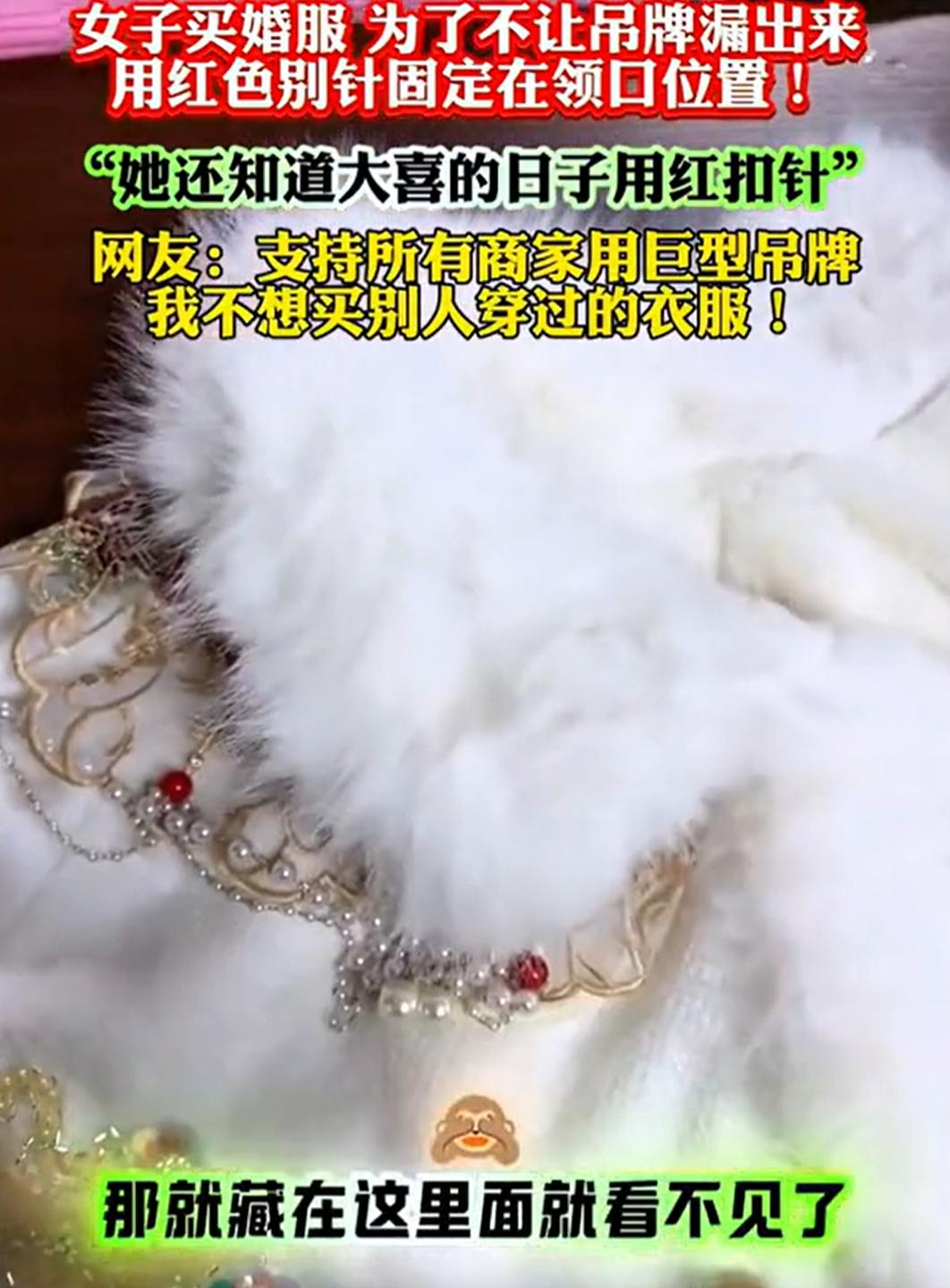 大喜的日子也要白嫖吗?安徽,一位商家吐槽,一名女客户在他这里网购了一件婚服,而对方为了能退货,竟然耍小聪明在吊牌上做了手脚,要不是衣服里面穿脏了,他还真看不出来,突然一下理解为什么那么多同行要把吊牌做大了 从男子拍摄的视频来看,在婚服的吊牌上面写着三个注意事项,就是不要带妆试穿,站在床上试穿、吊牌剪掉后不退换。可令男子没想到的是,对方不仅试穿了,还直接穿着衣服完成了婚礼 顾客在吊牌上面加了一个扣针,这样吊牌就可以固定在脖子上的位置,既不用把吊牌剪下来,穿着时又可以把领子放下来挡住。可她外面做的挺完美,衣服里面却穿的脏的不行,男子也是调侃说:穿的这么脏是因为没洗澡吗? 事后,男子也是将这个事发到网上曝光出来,并表示以后自己也要考虑换大吊牌了 有网友说:我不理解这种行为,哪怕只穿一次,我也是好好的洗净收藏在衣柜里面,包括我老公的西服也是,还放了干燥剂单独买大袋子装起来,这是我们幸福的起点,它是见证物,我就是要好好保存着 有人会说,婚服只穿一次,租也好买也罢,能省一点是一点。省钱本身没问题,但前提是方式正当。你可以选择租赁,可以提前沟通,也可以接受不退货的规则,唯独不该靠耍小聪明去转嫁成本 结婚是人生大事,婚服承载的意义,远超过它标签上的价格。哪怕以后不再穿,它也是一段重要记忆的见证。用一点小伎俩把它退掉,看似“赚了”,其实丢掉的,可能是自己的体面