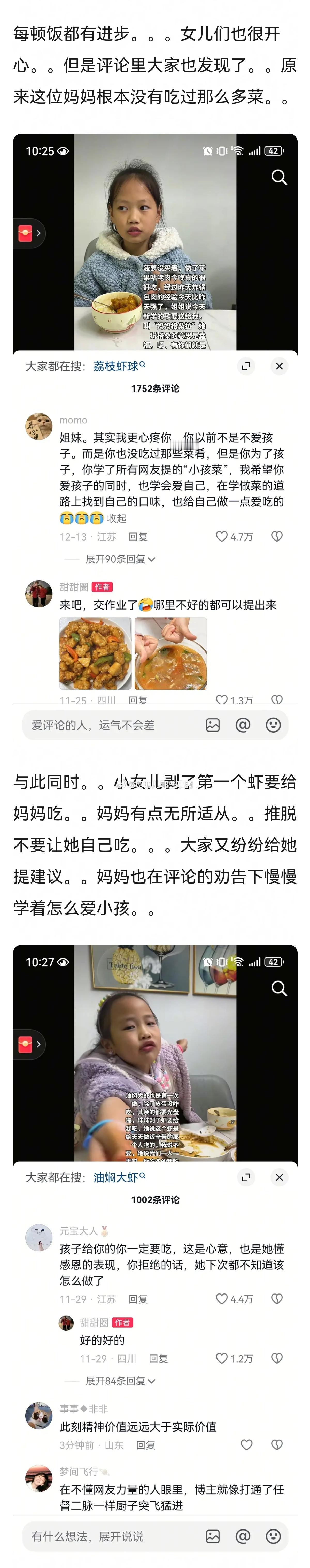 妈妈的爱可以抵御千难万险,只是没有人教会这位妈妈怎么去爱,互联网时代也许是为了弥补小时候不被爱的自己,又也许是不忍看到妈妈和女儿被隔在“表达”的门外进不来,大家都毫无保留地教给这位妈妈如何做菜、如何给予爱、又如何表达爱