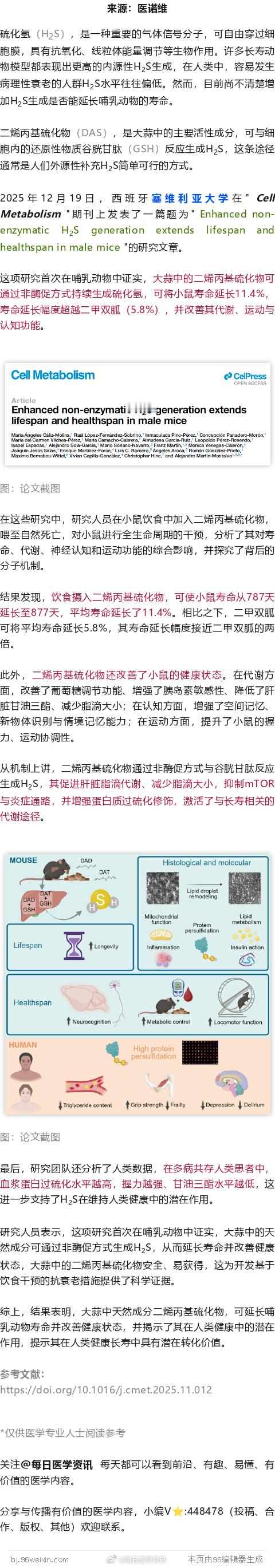 健闻登顶计划 延寿11%,超越二甲双胍!Cell子刊:大蒜中的天然成分,显著延长寿命,并改善代谢、认知2025年12月19日,西班牙塞维利亚大学在" Cell Metabolism "期刊上发表了一篇题为" Enhanced non-enzymatic H2S generation extends lifespan and healthspan in male mice "的研究文章。这项研究首次在哺乳动物中证实,大蒜中的二烯丙基硫化物可通过非酶促方式持续生成硫化氢,可将小鼠寿命延长11.4%,寿命延长幅度超越二甲双胍(5.8%),并改善其代谢、运动与认知功能。