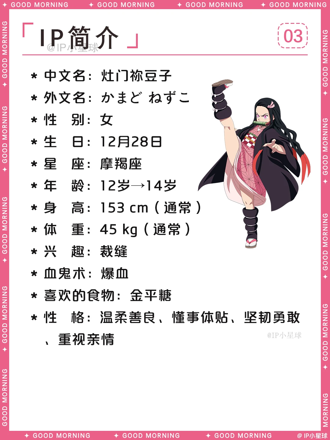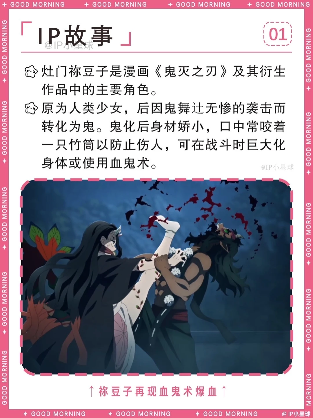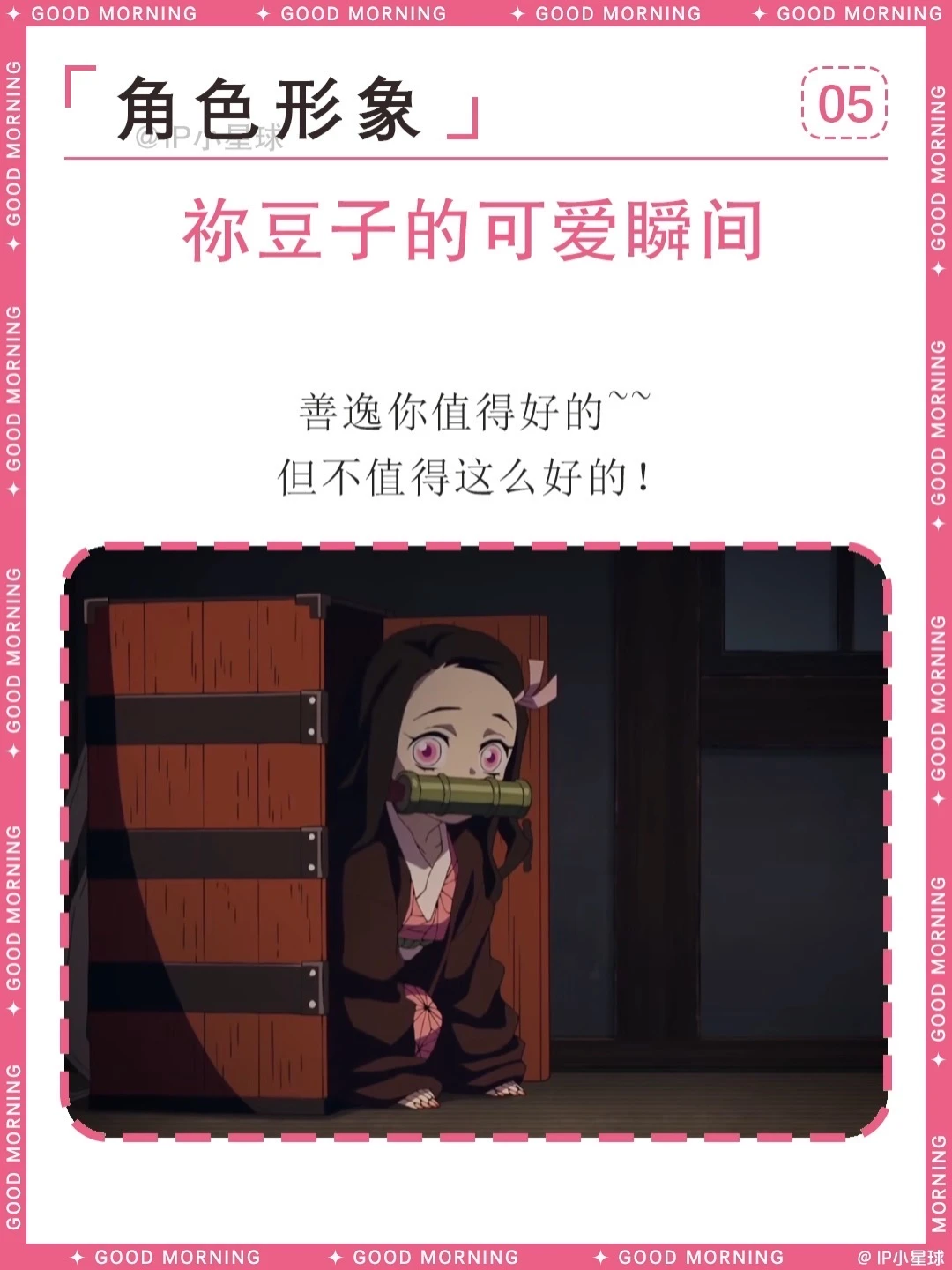 家人被害变鬼后,始终守住理智不伤害人类,跟着哥哥炭治郎一路闯关,用睡眠代替吃人真的太让人心疼。最终克服阳光、变回人类的结局圆满又治愈,还收获了善逸的深情守护。