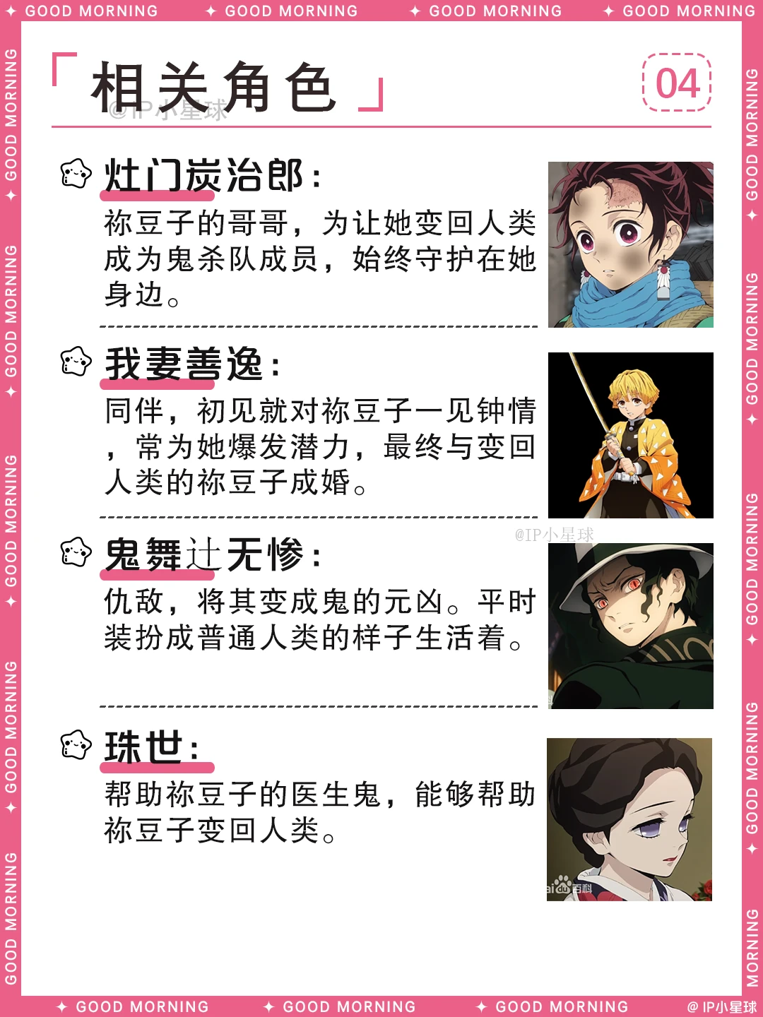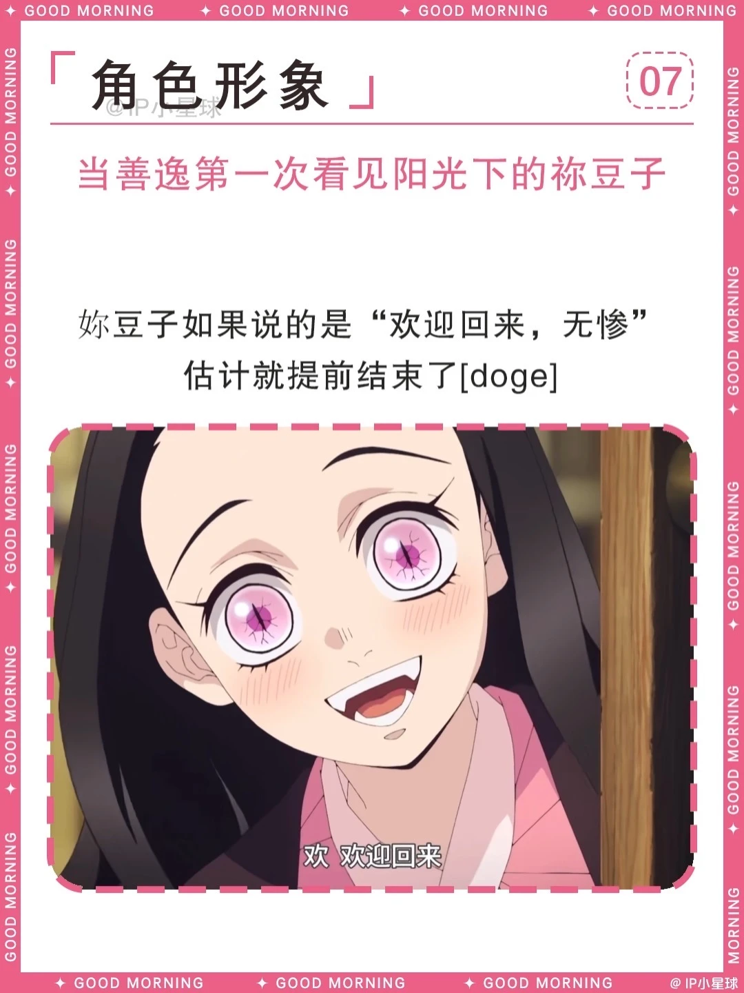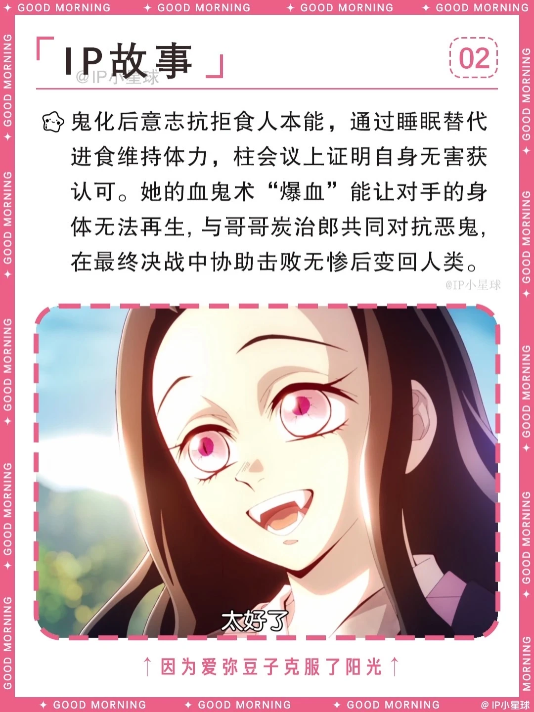家人被害变鬼后,始终守住理智不伤害人类,跟着哥哥炭治郎一路闯关,用睡眠代替吃人真的太让人心疼。最终克服阳光、变回人类的结局圆满又治愈,还收获了善逸的深情守护。