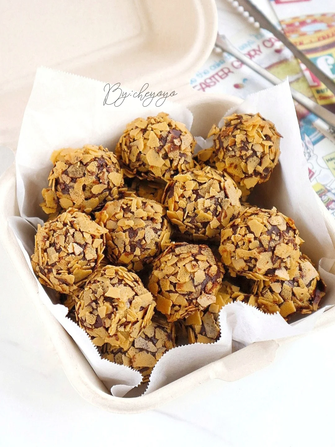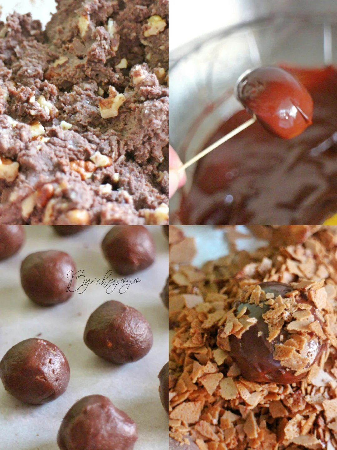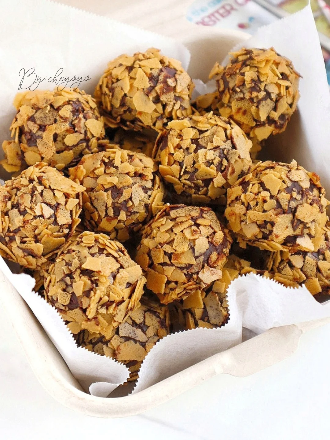 4⃣️ 黑巧克力隔热水融化,将冷却的曲奇裹上一层巧克力,再沾满黄油薄脆片,放入冰箱冷藏定型就好啦😏