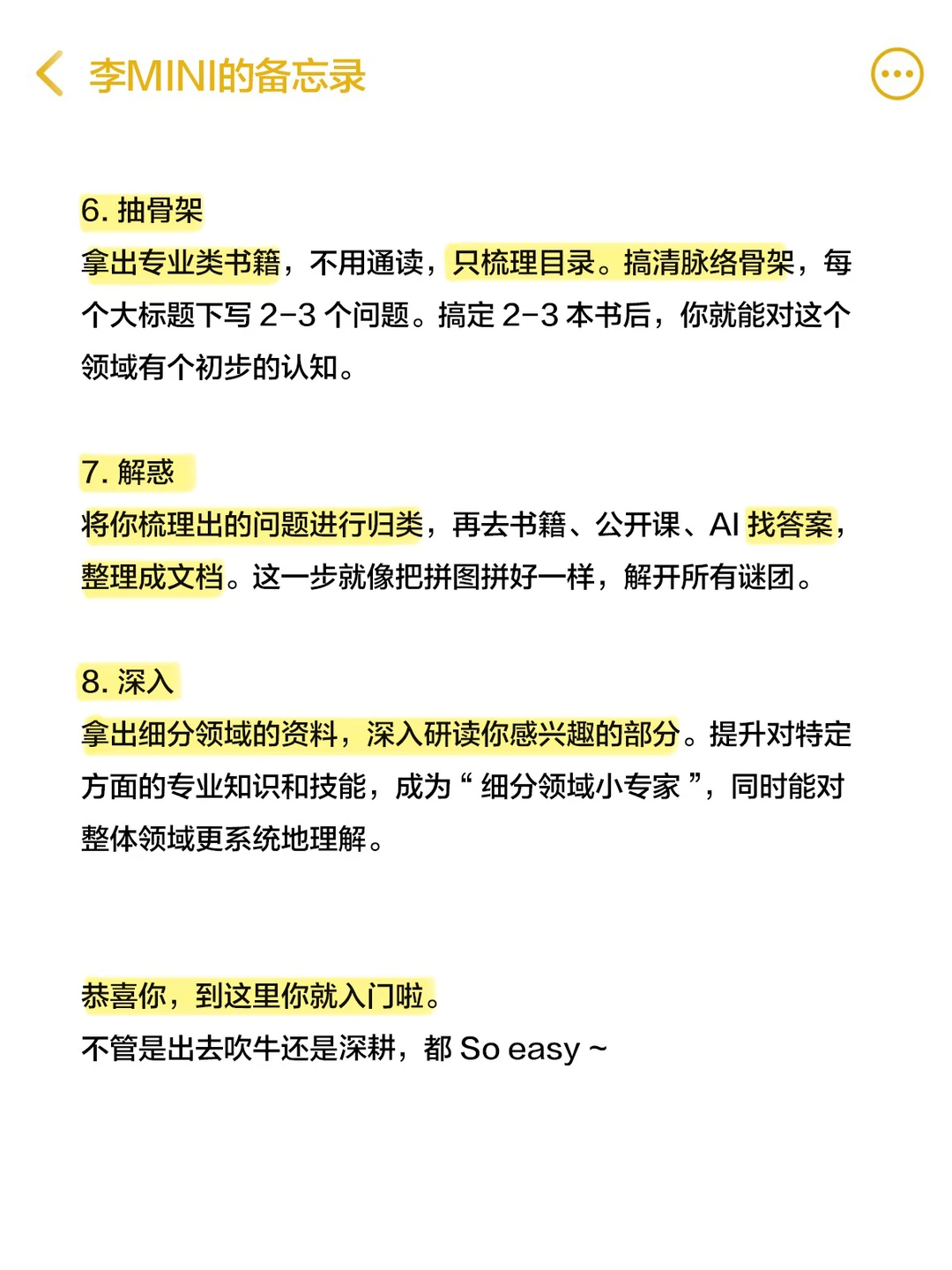 拿出专业类书籍,不用通读,只梳理目录,搞清脉络骨架。每个大标题下写2-3个问题。搞定2-3本书后,你就能对这个领域有个初步的认知。