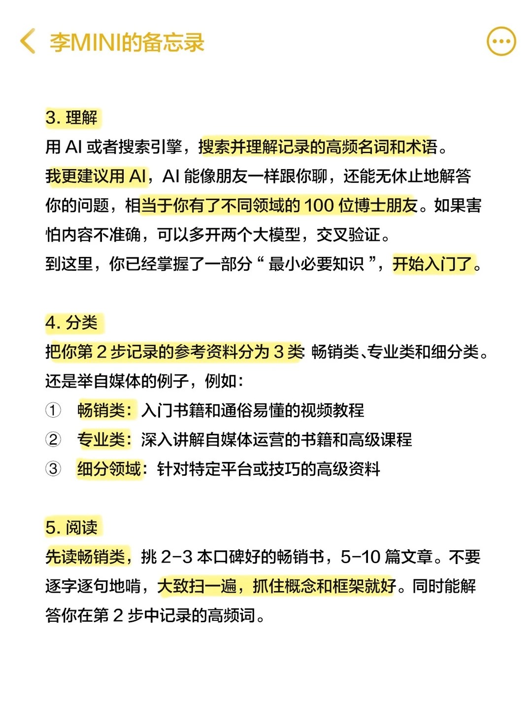 用AI或者搜索引擎,搜索并理解记录的高频名词和术语。到这里,你已经掌握了一部分“最小必要知识”,开始入门了。