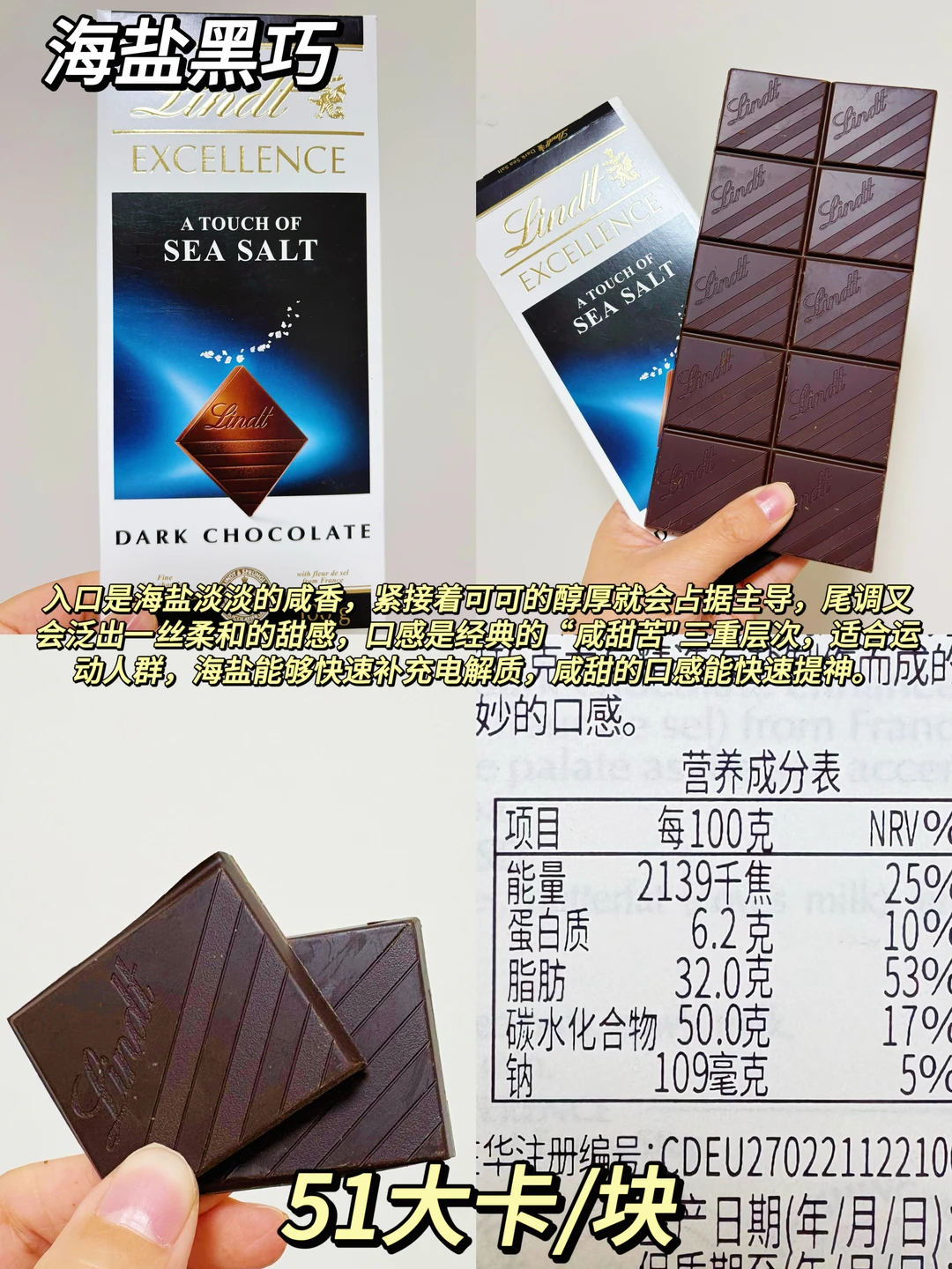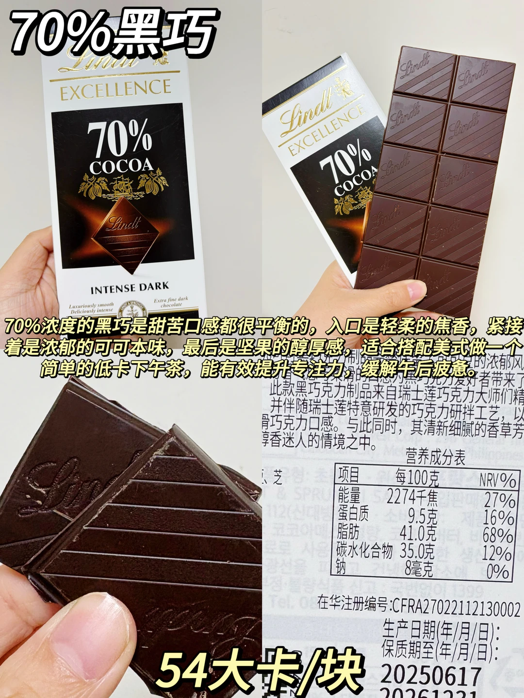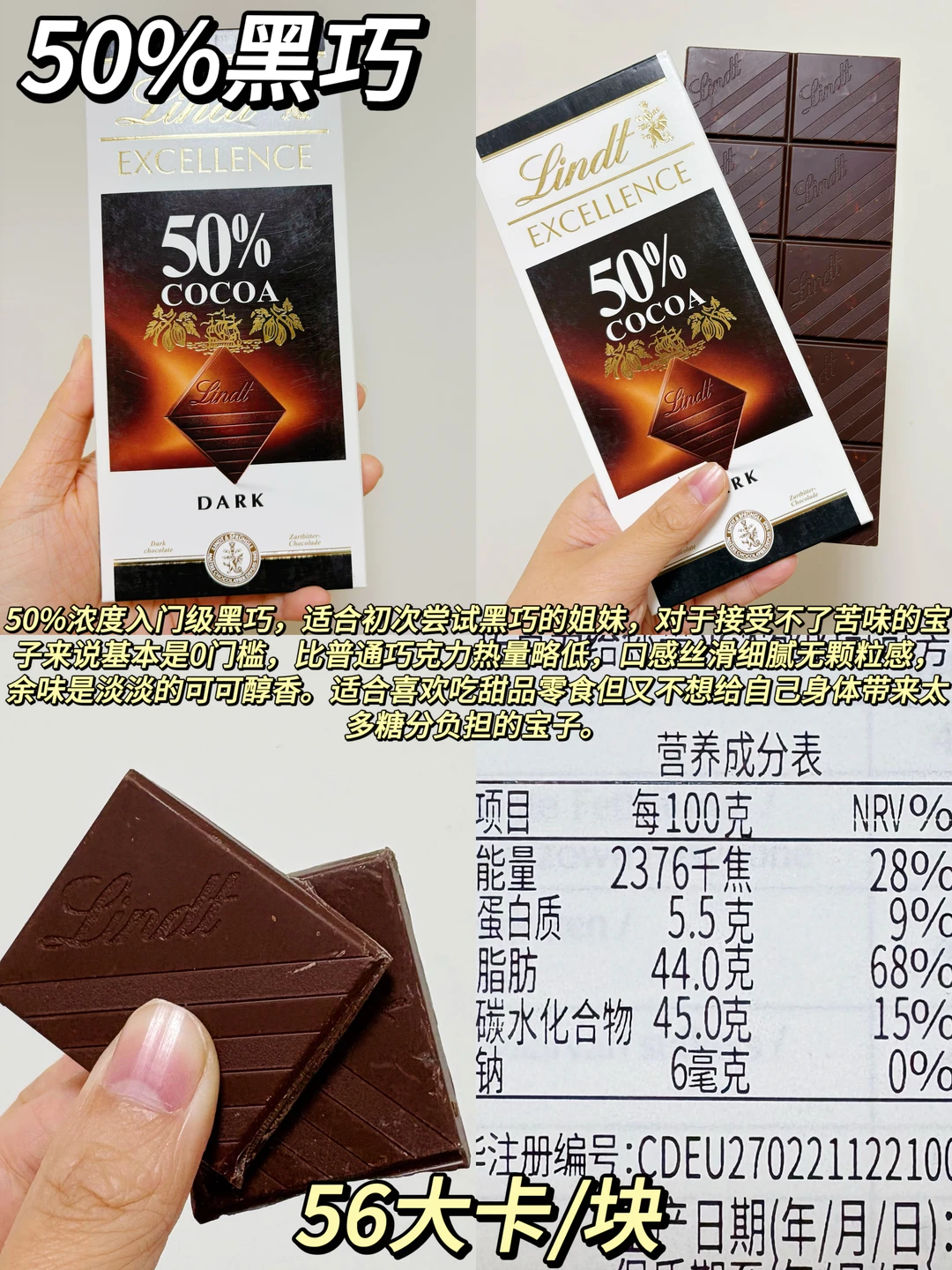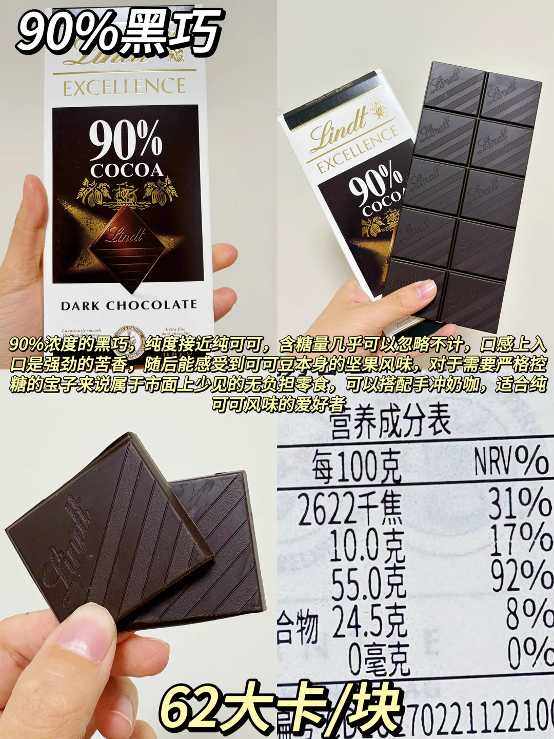 是谁还不知道黑巧是很适合管理期来吃的!既能解馋还能增强饱腹感!但是不知道怎么选?哪款能适配我们管理期需求?今天来测评一下,瑞士莲特醇全系列的黑巧(附热量)看看哪款更适合控卡的姐妹!