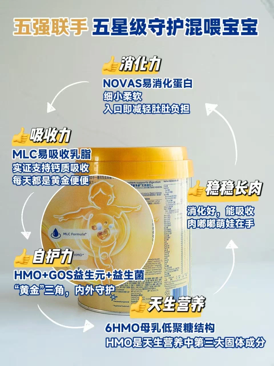 它升级了五强联手后,配方升级到妈妈心坎上了。全新的MLC易吸收乳脂,帮助钙质吸收,让噗噗可以更软乎!搭配NOVAS易消化蛋白,分子细小柔软,稳稳拿捏消化吸收,给肚肚打好基础,6种HMO结构,HMO内外兼守保护肚肚[赞R]加上超百种GOS益生元结构,益生元能为有益菌提供充足能量,再补充上HN019益生菌,这样的HMO+益生元+益生菌,形成坚固“黄金”三角,促进肚肚保持活力[哇R]