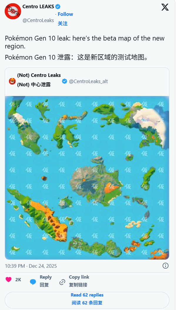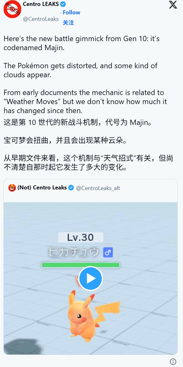 【第十代《宝可梦》大量新料曝光,男女主造型泄露】《宝可梦》第十代游戏《宝可梦:风 / 浪》消息再次泄露,这次由自称宝可梦侦探的Moot Monthly在推特上发布,泄露包含男女主角的测试版造型,以及他们用于移动的洛托姆滑板车。新教授:新教授形象曝光,被描述为浓眉大胡子的年长男性。他将在游戏的群岛场景中驾驶汽车,并在多个地点出现。新地区:泄露的测试版地图显示了一个由多个岛屿组成的群岛区域。早期报告称这些岛屿可能是程序化生成的,但不确定是岛屿形状固定、地形变化,还是陆地形态会为每个玩家改变。新战斗机制“魔人”(Majin):第十世代的新战斗机制代号为“魔人”。根据早期文件,该机制与“天气招式”有关,但具体关联方式尚不明确。泄露的开发中动画显示,此现象会扭曲宝可梦的物理形态,并产生某种云雾效果将其遮蔽。从对皮卡丘的影响来看,其具体战斗效果仍有待观察。所有泄露内容均为早期开发素材,不排除是Game Freak已废弃的概念。游戏正式公布时,实际内容可能与当前泄露有显著差异。