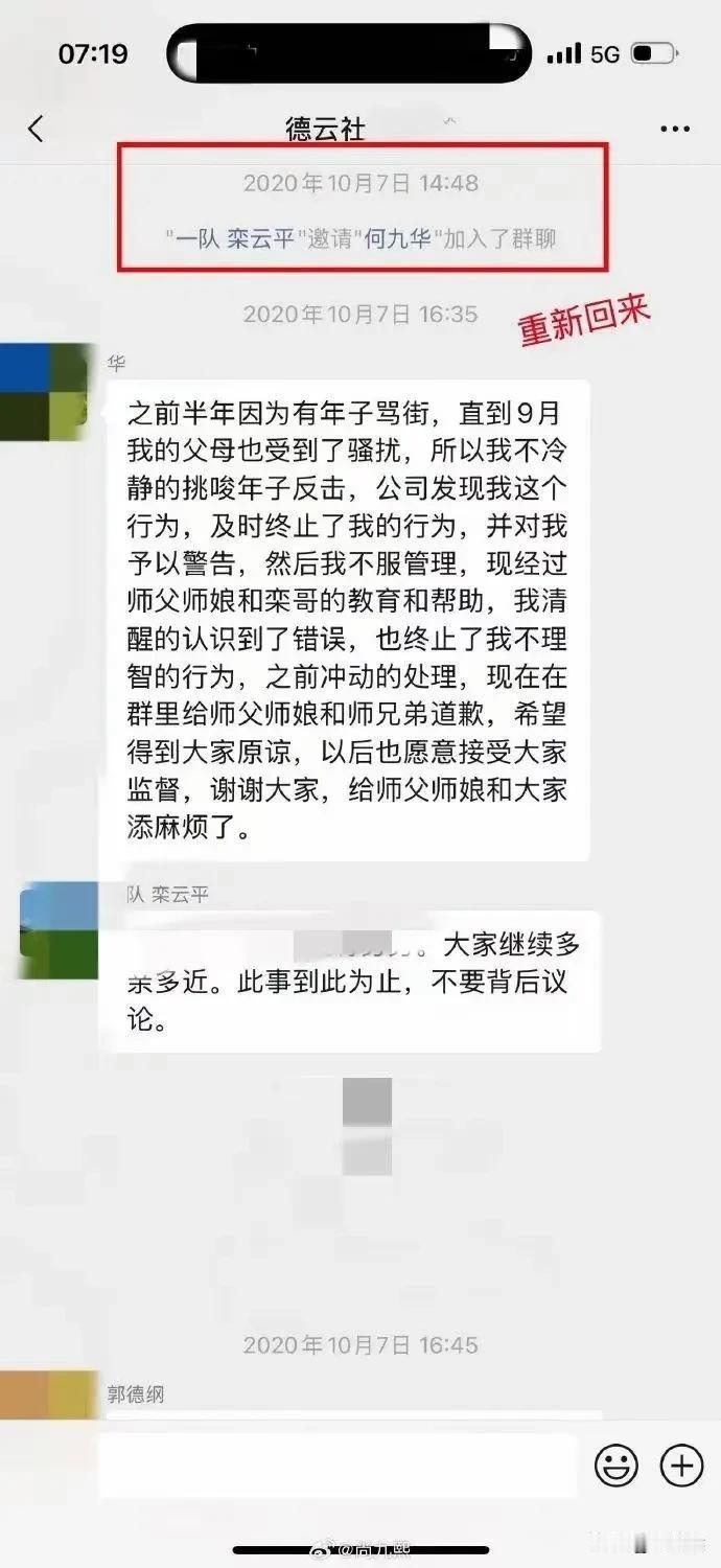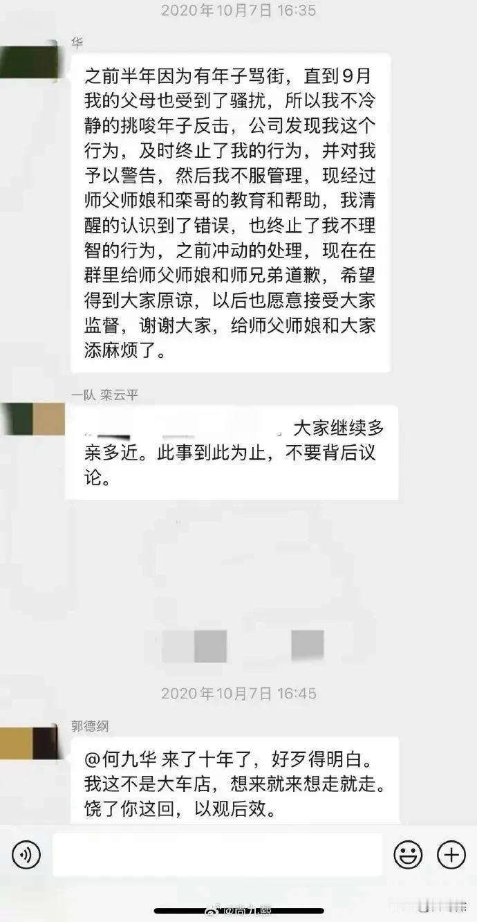 德云社风波再起 因尚九熙何九华“裂穴”,何九华曾出走,郭德纲:我这不是大车店,想来就来,想走就走。 这事要从尚九熙8月5号发长文说起。 8月5号,尚九熙在社交平台发布长文,讲述为何与何九华“裂穴”缘由。 做一个简单的梳理: 1.2020年天津团综前,何九华突然提出“裂穴”结束合作。此前两人已经共同巡演和举办专场。 2.青岛专场出现冲突,尚九熙彻夜写稿至凌晨四点,何九华却彻夜玩牌。演出前交稿时,何九华仅回复:“觉得不行,但我也不会改。” 3.何九华称“你太努力让我有压力”,没有正面回应合作问题;尚九熙指出何九华私下为老秦写活,却拒绝修改稿件。 4.何九华自2019年起已为裂穴与老秦搭档做准备。公司通知更换为“何九华老秦”“尚九熙彪哥”。 5.何九华回避追问,私下向师父表示“不干了”,被拉黑踢出群。后来,又在综艺节目造假,公开承认裂穴,却在节目里编造其他理由掩盖真相。 6.何九华回归后,被指毫无悔意,仅泛泛道歉。更是在直播中用印有尚九熙头像的杯子倒开水,说“我烫他脑袋”。 7.尚九熙六年来没有回应谣言,一度情绪低迷,还好有师父郭德纲支持。现在被迫公开,选择完整披露“裂穴”始末。