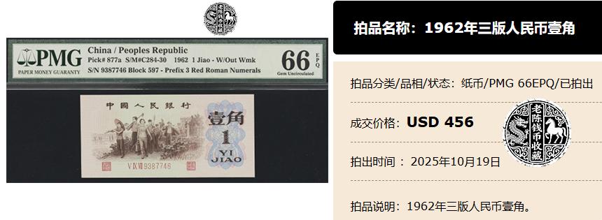 上面这张1962年的1角纸币,是在10月19号的时候拍出的,和第一种里面的一样,也是66分的评级纸币。