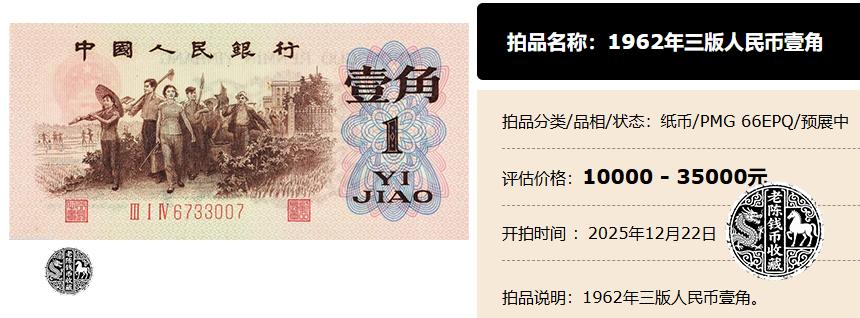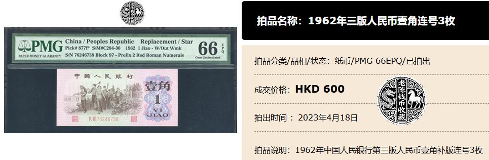 在2023年4月18号的时候,拍出过三连号的1962年的1角纸币,就只拍出了600港币。