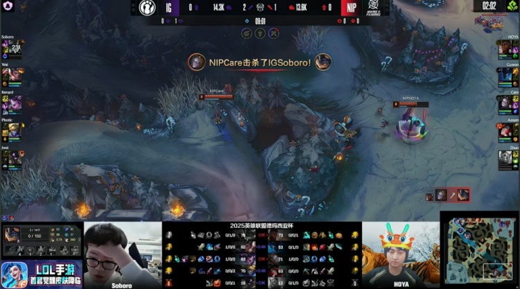 [13:59]Guwon梦魇下路带球配合Care发条开大终于逮捕Soboro,三角草iG二打四野辅被杀,NIP打出0换3,经济落后2k。