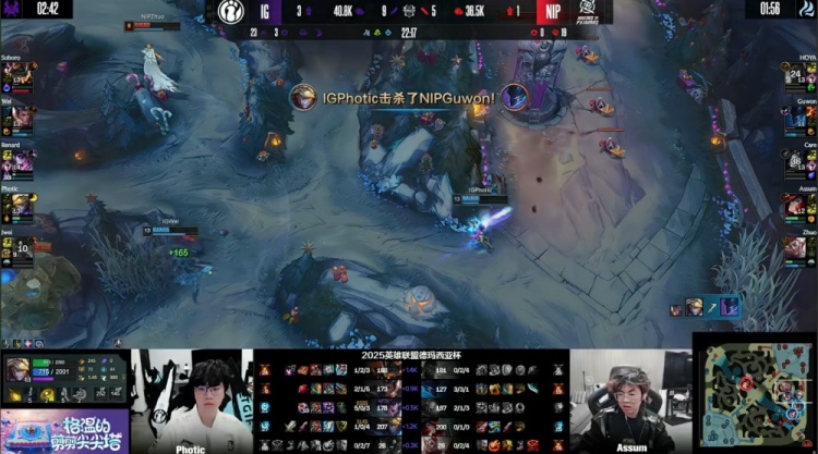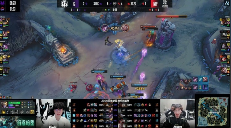 [24:21]iG下路推进,HOYA奎桑提开大将Wei赵信送到Assum女枪脸上,Wei笑纳大礼,iG打出0换3,推掉NIP中下两座二塔,经济领先8k。