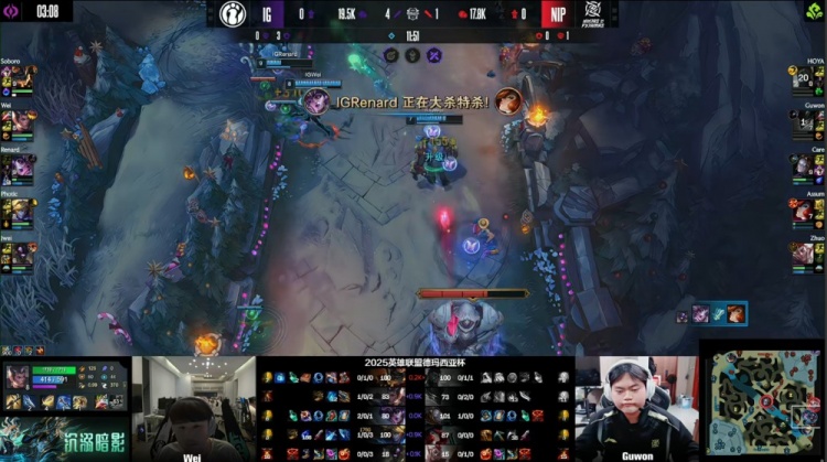 [21:45]厄塔汗团战,Wei赵信拿到厄塔汗,侧面Jwei牛头1v3被Guwon击梦魇击杀,Care发条没蓝被Wei捅飞,iG打出1换3,经济领先6k。