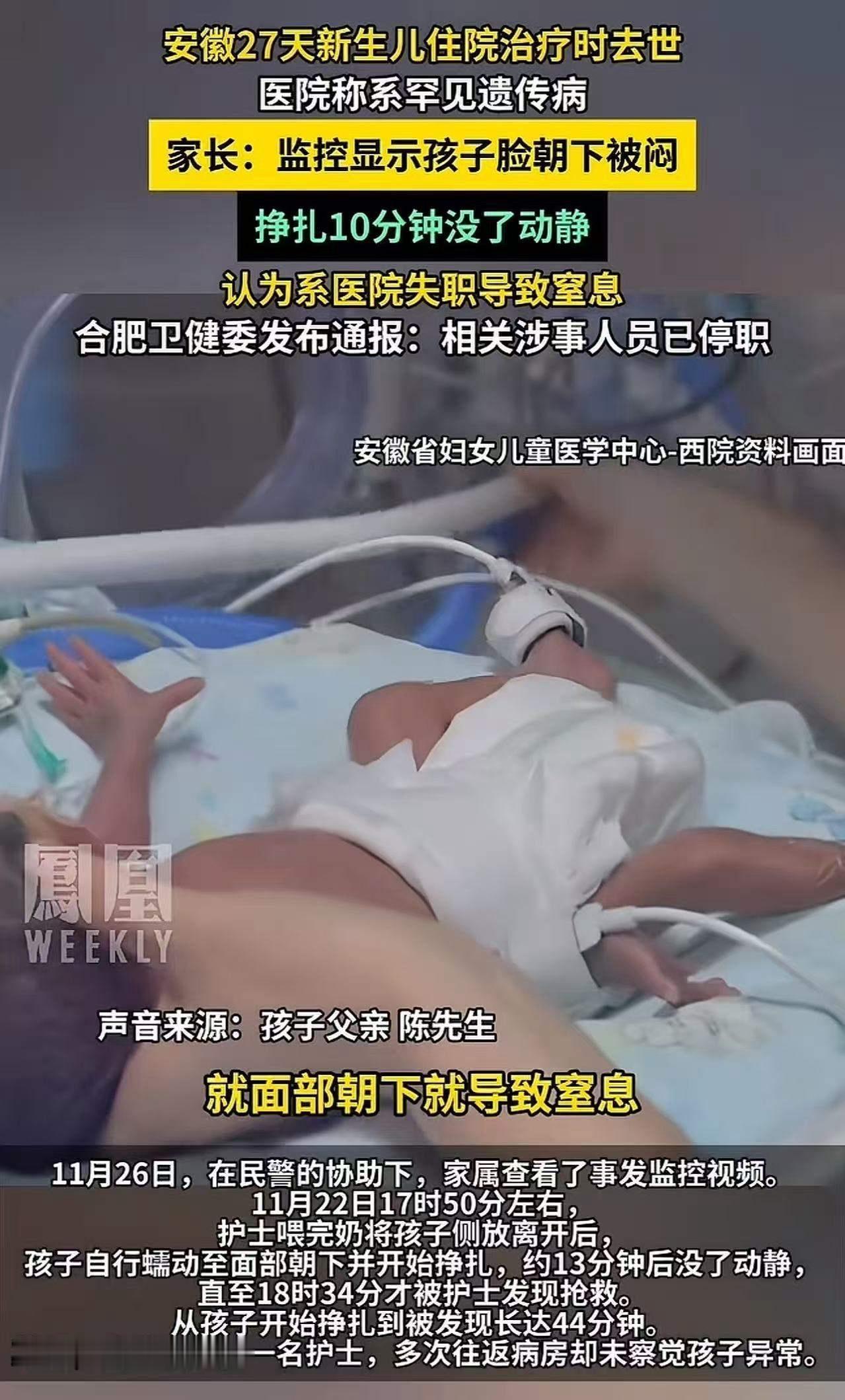 在合肥这个繁忙的城市角落,又一次令人心碎的悲剧震动了无数人的心。一个刚出生不久的生命,本应是充满希望和未来的象征,却在医院的阴影中悄然逝去。家长们带着满腔的期待,将孩子送进医院,却未曾想到迎来的竟是如此残酷的结局。 事情的经过令人发指:这名新生儿因黄疸住院治疗,医生们本应用专业和责任守护生命,却在关键时刻选择了推卸责任。监控录像显示,孩子脸朝下,被闷在床上挣扎了整整十分钟,而直到半小时后,才被人发现。那一瞬间,所有的希望都变成了绝望。家长们的心如刀绞,他们用颤抖的手查看录像,试图找到一丝救赎的可能,却只看到一个无法呼吸、无助的生命在无声的抗争中逐渐远去。 医院方面一开始竟然试图推卸责任,声称孩子的死亡是遗传病所致。这种荒谬的辩解,无疑是在践踏家属的心,也在践踏公众的良知。难道一个新生儿的生命,竟然可以被如此轻描淡写地归咎于“遗传”?难道医院的责任可以如此轻易地被抹去?这背后,是制度的漏洞,是责任的缺失,更是对生命的极度漠视。 网友们的愤怒如火山喷发:“孩子是来治病的,结果却在医院丢了命,这太让人心碎了!”“医院难道不应该是守护生命的地方吗?为什么会发生如此不可思议的事情?”“难道我们的生命在某些地方就这么脆弱、这么无助?”这些质问,折射出社会对医疗安全的深刻担忧,也让人不禁反思:我们到底还剩下多少对生命的敬畏和信任? 这起事件再次提醒我们,生命的脆弱和宝贵,绝不能被任何疏忽和冷漠所玷污。每一个新生命都值得被用心呵护,每一个家庭都应得到应有的尊重和保障。我们不能让悲剧成为常态,更不能让责任成为推诿的借口。 在这个充满不确定的世界里,唯有正义和责任才能为我们带来一丝希望。我们呼吁相关部门彻查此事,追究责任,让这位无辜的孩子得到应有的交代。也希望每一位医务人员都能以生命为重,用心守护每一个生命的火苗。因为,只有这样,社会才能真正变得更加温暖和有希望。 生命,没有重来的机会。让我们用行动,守护每一个天使的微笑,让悲剧不再重演。每一个孩子,都是这个世界最纯真的礼物,值得我们用全部的爱去珍惜和守护。刺痛人心的悲剧 儿童医院悲剧 医院里痛心一幕