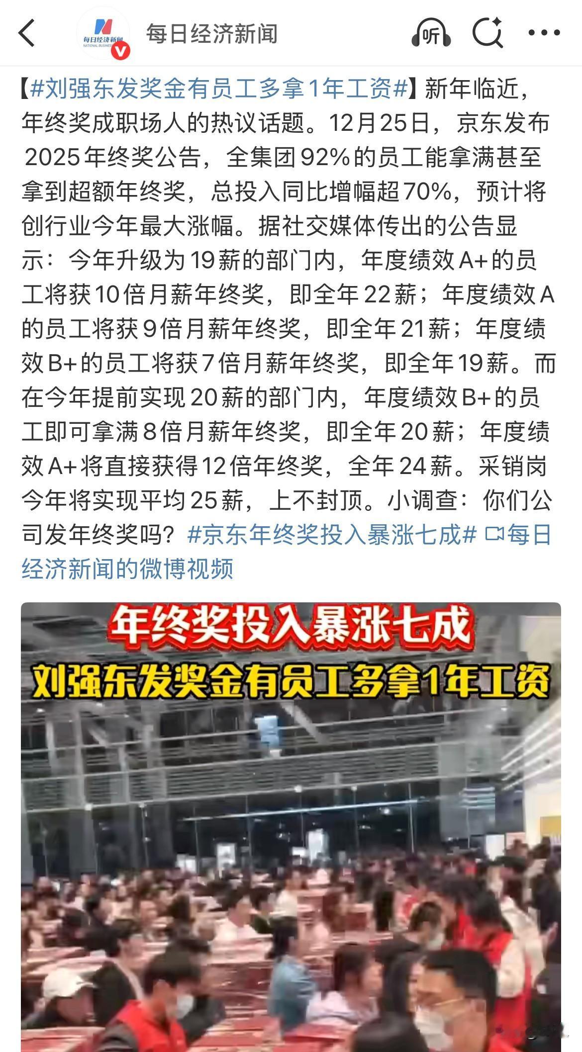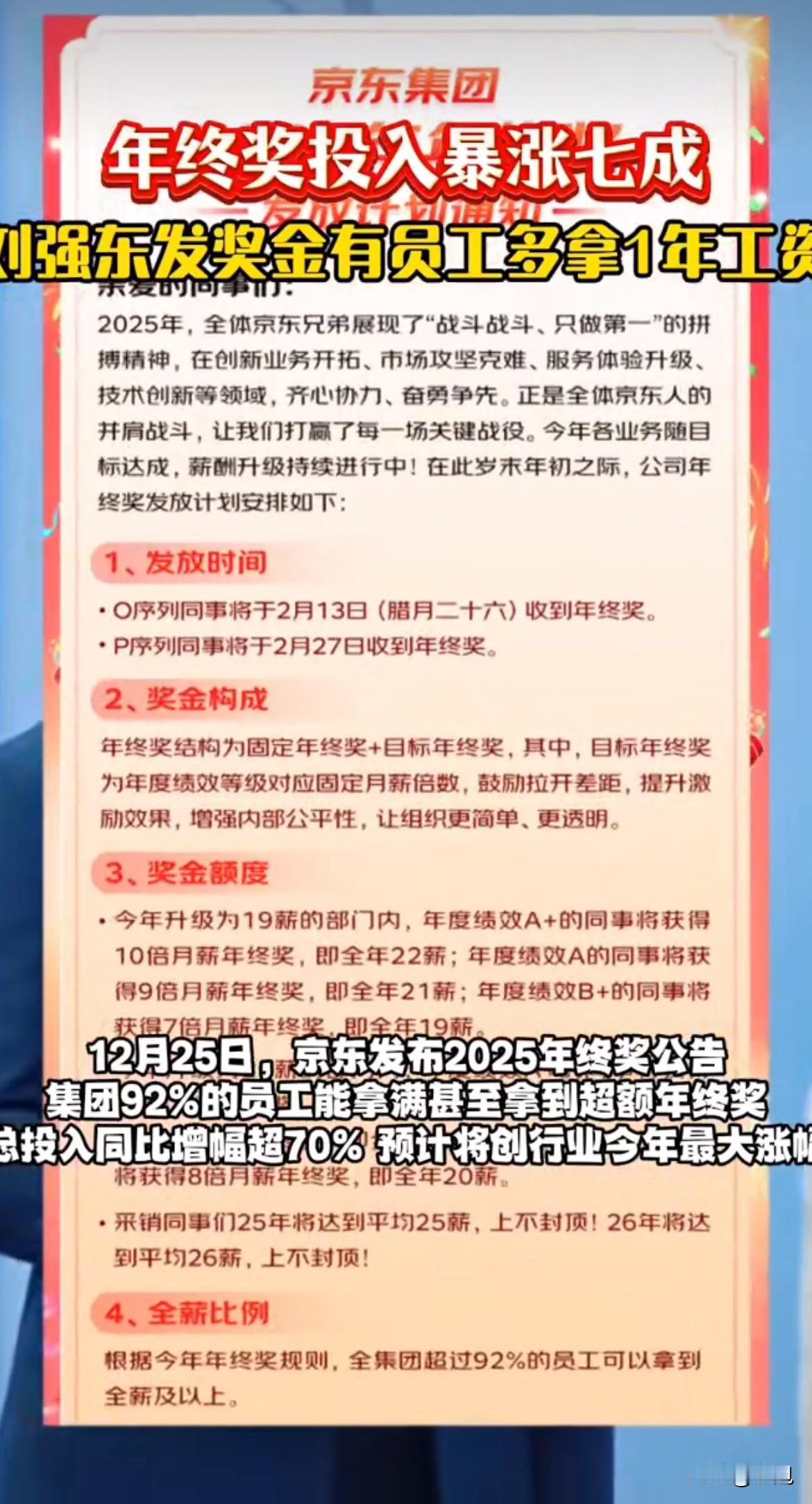 听到有人说,京东发年终奖是“炒作”。如果发钱多也算炒作,那这种炒作请多来一些。 真金白银拿出来,92%的员工能拿到满额甚至更多,总奖金池大增七成。业绩顶尖的员工,真能多拿一年工资。就算这里面有宣传的成分,但员工拿到手的实惠是实打实的。 这种“炒作”其实拉高了好公司的标准。它让所有人看到,真有企业愿意把利润大方分给员工。这对打工的人来说是好事,相当于立了个标杆:以后谈回报,有例子可循了。 希望老板们都大方点,市场竞争,说到底也是人才竞争。钱给到位,是最直接的诚意。如果这样的“炒作”能促使更多老板思考如何更好地激励团队,那绝对是良性循环。 所以,别管是不是“炒作”。关键看结果:钱发下去了,员工受益了,行业的标准也在被悄然推动。这怎么看都是一件值得鼓掌的事。 你对此事怎么看?
