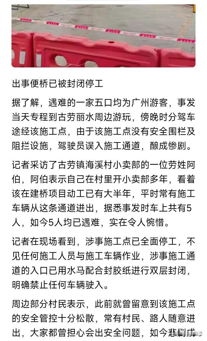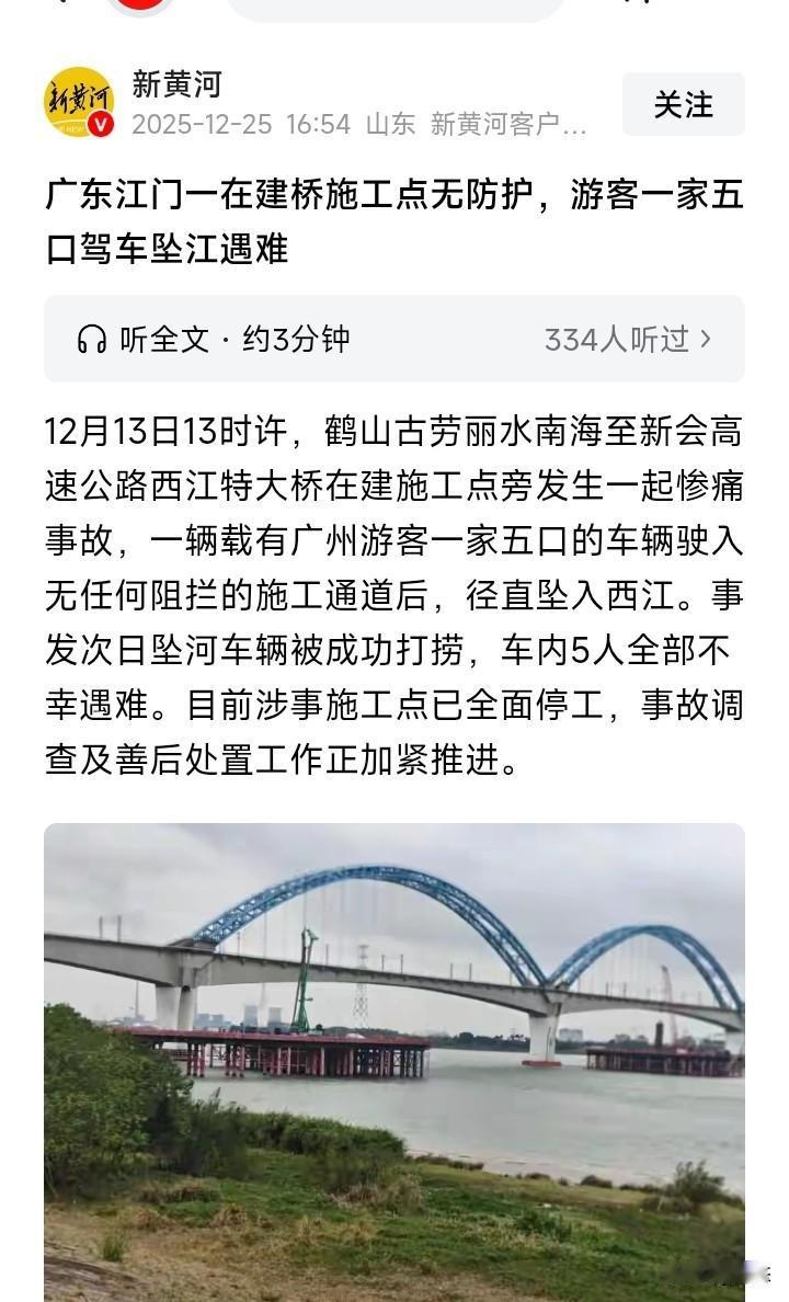 悲剧,广东江门鹤山古劳丽水发生一起令人痛心的事故。一家五口广州游客驾车到周边游玩,傍晚途经南海至新会高速公路西江特大桥在建施工点时,因施工点无安全围栏和阻拦设施,车辆驶入无防护施工通道后坠入西江,5人全部遇难,次日坠河车辆被打捞。 这个项目是广东省重点交通基建,全长约50公里,投资130.63亿,2024年底开工,事发路段是衔接主桥施工的临时便道。如今涉事施工点停工,可一条鲜活的生命消逝,实在令人惋惜。希望相关方加强施工安全防护,避免类似悲剧再发生。 生命只有一次,自己的生命自己把握,施工方虽然有过错,想不明白为什么会开到上面去,估计是车速过快,来不及反应了。 在这里希望大家开车的时候一定要注意路况,特别是那些断头路。 希望大家引以为戒!安全标识不能马虎!